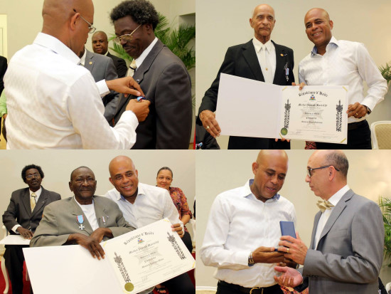 Father Antoine Jean Occide, sociologist and ethnologist, was decorated with the National Order of Honor and Merit to the Grade of Grand Officer for his contribution to community development. "Excellency, honest men, serious and lucid see by your actions, your determination to extinguish the fire with fire. In fact, you are currently, through your social works, your highly humanitarian actions, extinguish the fire of hate with the fire of love..." declared Father Sicot. Mr. Raoul Guillaume, first composer of Christmas songs and great Mapou of the Haitian music, was decorated with the National Order of Honor and Merit to the Grade of Knight for his consistency on the music scene. Mr. Raymond Guillaume spoke on behalf of his older brother Raoul Guillaume. Rodrigue Millien for his contribution to the development of music, was decorated with the National Order of Honor and Merit to the Grade of Knight, the artist has 28 albums to his credit, after having received his decoration, with the President Martelly has made a short musical performance recalling the good times between the two artists. Dr. Didier Armand received the award posthumously for the storyteller Mimi Barthélémy [Michele Armand]. She is ecorated with the National Order of Honor and Merit to the Grade of Knight for her talents as a storyteller and for all her work. Also that same day, the President Matelly inaugurated the renovation work of "Studio I" of the Haiti National Television baptized "Studio Rodrigue Millien" in tribute to an incomparable musician, considered as one of the most worthy representatives of the national kind "Troubadour" commented the Head of State who believes "that by his fabulous course that marked generations of music lovers, Mr. Millien deserves this attention, which will also contribute to encourage young artists to work harder." HL/ HaitiLibre