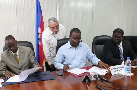 On Friday, the final Convention of agreement establishing the first Agricultural Free Zone in Haiti was signed by Wilson Laleau, acting Minister of Trade and Industry and President of the National Council of Free Zones, Rode Préval Director General of the Directorate of Free Zones and Jovenel Moïse, CEO of Agitrans S.A., carrier of project Nourribio, the first Agricultural Free Zone in Haiti. The project Nourribio, is expected to create over five years, nearly 3,000 direct jobs and 10,000 indirect jobs. Located in Trou du Nord, less than 30 km from the Port of Cap Haitien and the Haitian-Dominican border, the first Agricultural Free Zone, will produce approximately 20,000 tonnes of organic bananas and other vegetables from the organic production. For Mr. Jovenel Moïse, it is "that Haiti finds its place on the world map of countries exporting bananas and vegetables." Rode Préval, has welcomed the creation of the first Agricultural Free Zone that he considers as a "balanced and innovative project." He also stressed that the project aims not only to improve the culture conditions on the 1,000 hectares dedicated to Nourribio, but also to increase the incomes of small farmers, and significantly improve their purchasing power and quality of life. Indeed, in the fair trade approach, which will be initiated by Nourribio, it is expected that 20% of profits are redistributed to small farmers living far below the poverty line.