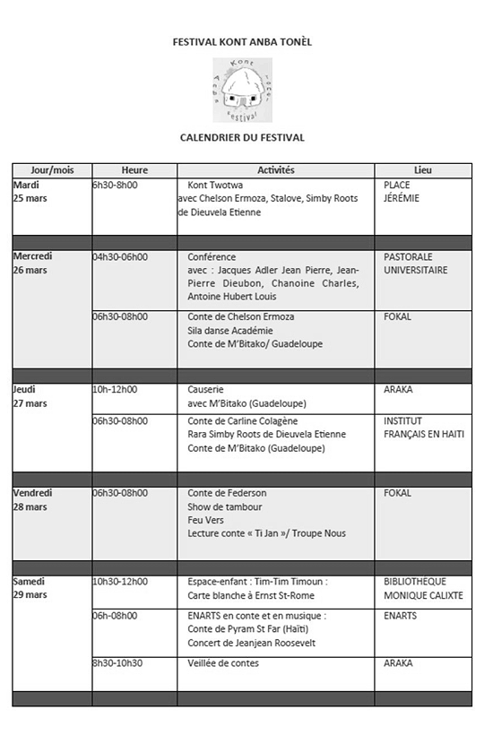 Mardi, le Festival s’ouvrira sur la place Jérémie, à Bas-peu-de-chose, avec deux représentations de contes de Chelson Ermoza et Staloff Tropfort alias « Estalove Wòklò » et une performance de « Symbi Roots » (ex-Rara fanm) de Dieuvela Etienne. La principale nouveauté de cette édition, c’est le conte trottoir (Kont twotwa). Le choix de cet espace libre annonce la nouvelle orientation du Festival dans les années à venir. Il se déroulera sur des places publiques, aux coins des rues, sur les trottoirs. Pour les organisateurs, le conte ne peut être enfermé dans des lieux traditionnels et conventionnels, il faut le rendre accessible à un plus large public. À cette nouveauté, s’ajouteront cette année : l’introduction du rara avec « Symbi Roots », de la marionnette, avec Ernst St-Rome, du slam avec le collectif « Feu vers » et de la lecture-spectacle avec la « Troupe Nous Théâtre », de Guy Régis Junior. Le festival s’achèvera samedi 29 mars avec un concert de Jeanjean Roosevelt, médaillé d’or des 7ème jeux de la Francophonie. https://www.haitilibre.com/article-9440-haiti-culture-felicitations-a-jean-jean-roosevelt-medaille-d-or-de-la-chanson-francophone.html Le Comité du festival remercie, la Fondation Connaissance et Liberté (FOKAL), le sponsor officiel du Festival, l’Institut Français en Haïti et tous ceux en général, qui contribuent d’une façon ou d’une autre au succès populaire de cette fête de l’imaginaire. Programme de la 5e édition du festival Kont anba tonèl :