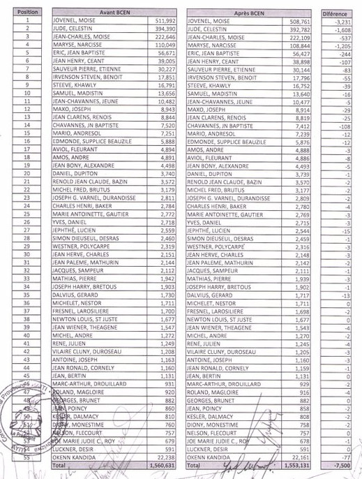 Le Conseil Électorale Provisoire (CEP), vient de publier les résultats définitifs pour le premier tour de l'élection présidentielle du 25 octobre 2015. Jovenel Moïse (PHTK) a obtenu 508,761 votes soit 32.76% lors des résultats préliminaires il avait obtenu 511,992 votes 32.81% Jude Célestin (LAPEH) a obtenu 392,782 votes soit 25.29% lors des résultats préliminaires il avait obtenu 394,390 votes 25.27% 12,913 procès-verbaux sur 13,725 ont été inclus, il y a eu 1,530,970 votes valides/choix exprimé, 22,161 votes valides/aucun candidat et 119,800 votes nuls Liste de tous les candidats :