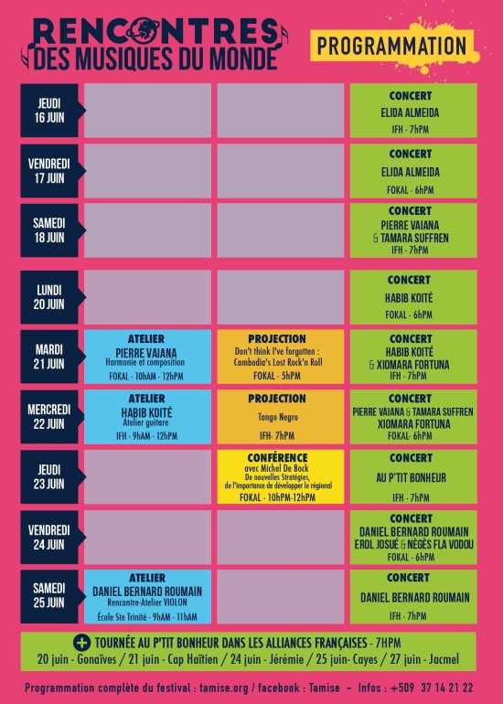 Du 16 au 25 juin 2016, l’Association Tamise, en collaboration avec Caracoli, annoncent la deuxième Édition des Rencontres des Musiques du Monde , avec de nombreuses activités (ateliers, débats, conférences et projections) et une belle brochette d‘artistes à découvrir ou à redécouvrir en concerts gratuits durant 10 jours dans différents lieux partenaires (la FOKAL, l’Institut Français en Haïti et l’Ecole de musique Ste Trinité) Réalisée autour de la Fête de la Musique, cette évènement réunit aux côtés des musiciens haïtiens, des artistes en provenance de la Caraïbe (République Dominicaine), de l’Europe (Belgique, France) et de l’Afrique (Cap Vert, Mali). Les Rencontres des musiques du monde suivent une double préoccupation : la promotion des musiques actuelles conçues à partir des musiques traditionnelles, et la question du marché pour les musiques du monde, notamment les musiques caribéennes. Programme complet :