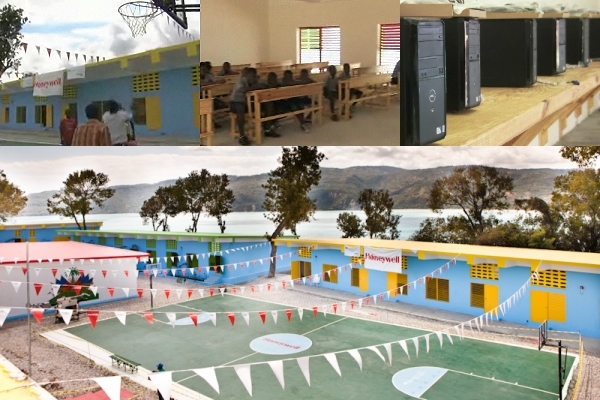 Dave Cote, Président Directeur Général de Honeywell et Tom Buckmaster Président de Honeywell Hometown Solutions, ont récemment rejoint les étudiants, parents, enseignants, administrateurs scolaires et des leaders communautaires pour ouvrir l'Ecole Nationale Jacob Martin Henriquez. Une nouvelle école publique à la fine pointe, dans la ville de Jacmel (Sud-Est), durement touchée par le sésime. Le nouveau complexe scolaire de neuf bâtiments offrira une nouvelle « maison d'éducation » et des repas gratuits à plus de 600 enfants de la région, de la maternelle à la 7ème [6ème année fondamentale aussi appelée 7ème ou CEP (Certificat d'Études Primaires)]. Avant le séisme, l’ancienne école (détruite par le séisme) accueillait 400 élèves âgés de 7 a 17 ans. Le nouveau complexe scolaire, qui a été bâti sur un terrain d'un acre et demi surplombe la baie de Jacmel, offre à 600 élèves de la maternelle à la 7ème un nouveau centre éducatif gratuit, ayant comme atout un laboratoire informatique, une bibliothèque, une cafétéria, un bâtiment pour l'administration, six bâtiments pour les classes, un jardin communautaire durable et un terrain de sports.