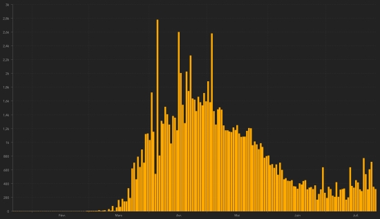 France : (NOTE : Santé Publique France n’a pas publiée de mise à jour de la situation. Les données ci-dessous sont donc les mêmes que celles de notre bulletin de la veille.) Situation épidémiologique : Cas confirmés depuis le premier cas : 217,797 (+1,130), précédent (+1,062) Guérisons : 80,804 personnes (+343) , précédent (+515) Taux national de Guérison : 37.10% (-) Décès : 30,172 décès (+10 correction de Santé Pubique France), précédent (+10) Cas actifs : (excluant décès et guérisons) 106,821 (+777), précédent (+537) Amérique latine et Caraïbe cas actifs : Brésil : 519,174 cas (-3,531 en 24h) la veille (+13,682) Pérou : 90,268 cas (-4,720 en 24h), la veille (-3707) Argentine : 89,069 cas (+1,650 en 24h), la veille (+2,153) Equateur : 40,283 cas République Dominicaine : 33,242 cas (+1,381 en 24h), la veille (+1,445) Panama : 24,871 (+710 en 24h), la veille (+122) Chili : 18,583 cas (+180 en 24h), précédent (-291) Guyane française : 6,404 cas (mise à jour non disponible) Haïti : 2,793 cas (+18 en 24h), précédent (-93) Bahamas : 240 cas (+16), la veille (+10) Martinique : 161 cas (mise à jour non disponible) Jamaïque : 118 cas (+2), la veille (+6) Guadeloupe : 106 cas (mise à jour non disponible Cuba : 59 cas (+13 en 24h), la veille (+5) HAÏTI : Situation épidémiologique : Selon le Ministère de la Santé Publique, 18 nouveaux cas de Covid-19 auraient été confirmés en Haïti en 24h la veille (+37), pour un total de 7,315 cas sur l’ensemble du territoire national (41.0% de femmes et 59.0% d’hommes) depuis le premier cas (19 mars 2020 https://www.haitilibre.com/article-30319-haiti-sante-origine-des-2-premiers-cas-de-covid-19-en-haiti.html ). Décès : Aucun nouveau décès enregistré. Total national 157. Guérisons : : 4,365 personnes (inchangé en 24h),précédent (+129 en 48h) Taux de guérison : 59.67% (-) Cas actifs : (moins décès et guérisons) 2,793 cas (+18 en 24h), précédent (-93) Cas importés : 152 cas depuis la réouverture des aéroports et +43 depuis le dernier bilan datant du 9 juillet (109) https://www.haitilibre.com/article-31348-haiti-flash-152-cas-importes-depuis-la-reouverture-des-aeroports.html (actualisation non disponible) Cas suspects investigués depuis le 19 mars : 17,584 cas (+241 en 24h), précédent (+141) Cas testés depuis le début de la pandémie : 17,129 en date du 25 juillet (+106 en 24h) Personnes hospitalisées actuellement : (information non disponible) Personnes en soins intensifs actuellement : (information non disponible) Personnes en quarantaine à domicile actuellement : (information non disponible) Graphique* : cas confirmés quotidien