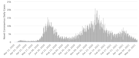 Cas importés : 152 cas depuis la réouverture des aéroports et +43 depuis le dernier bilan datant du 9 juillet (109 cas) https://www.haitilibre.com/article-31348-haiti-flash-152-cas-importes-depuis-la-reouverture-des-aeroports.html (Depuis, ces informations ne sont plus rendues disponibles) Cas suspects depuis le 19 mars : 68,232 cas (+401 en 24h) mise à jour 29 mai dernières données disponibles. Cas testés depuis le début de la pandémie : 73,892 cas (+332 en 24h) mise à jour 29 mai, dernières données disponibles. Notez que le très faible nombre de personnes testées ne permet pas statistiquement de faire une estimation représentative des cas de Covid-19 en Haïti. À titre de compraison, nos voisin dominicain totalisent jusqu’à présent près de 1,6 million de tests réalisés. Personnes hospitalisées : 2,323 personnes depuis le début de l’épidémie (+31 nouveaux malade hospitalisé en 24h pour un total confirmé de126 personnes hospitalisées et 24 cas en soins intensifs. Mise à jour 28 mai 2021, dernières données disponibles. Personne en isolement : 2,172 personnes depuis le début de l’épidémie (+114 en 24h) en date du 28 mai (dernières données disponibles) Personnes traitées à domicile actuellement : 3,909 depuis le début de l’épidémie (+746 en 24h) en date du 28 mai dernières données disponibles). Cas confirmés par département : Ouest : 10,843 (+61) Nord : 931 (+7) Centre : 804 (+1) Artibonite : 758 (+6) Nord-Est : 397 (+3) Sud-Est : 336 (inchangé) Sud : 315 (inchangé) Nord-Ouest : 301 (inchangé) Grand'Anse : 271 (inchangé) Nippes : 167 (inchangé) ÉTATS-UNIS : Situation épidémiologique : États-Unis : *Cas depuis le premier cas (9 mars 2020) : 34,174,752 cas (+20,447 en 24h), la veille (+17,567) *Guérisons : 28,025,575 guérisons (+39,064 en 24h), la veille (+45,593) Taux national de Guérison : 82,00% (+) *Décès : 611,611 décès (+591 en 24h), la veille (+584) Taux national de mortalité : 1,78% (=) *Cas actifs (moins décès et guérisons) : 5,537,566 cas, (-19,208 en 24h), la veille (+28,610) *Tests : (482,399,824) personnes testées depuis le premier cas. USA : Nombre de cas confirmés quotidiens :