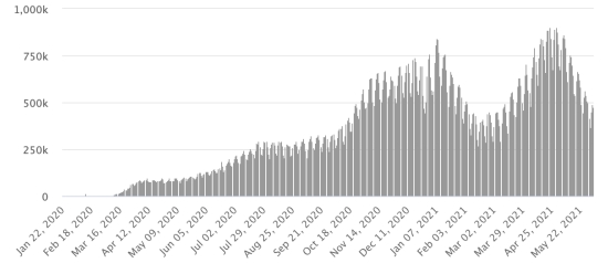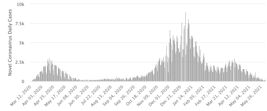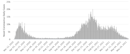 Nouveaux cas en bleu chiffres à gauche - Nouveaux décès en rouge chiffres à droite Vaccination : 297,72 millions de doses de vaccin injectées depuis le 14 décembre 2020 date de la première injection aux États-Unis (+810,000 doses injectées, en 24h). Mis à jour 3 juin 2021 dernières données disponibles). État de New York : *Cas depuis le début de l’épidémie (1er mars 2020) : 2,156,270 cas (+905 en 24h), la veille (+434) *Guérisons : 1,737,401 guérisons (+6,306 en 24h) la veille (+5,971) Taux de guérisons : 80,57% (+) *Décès : 53,654 décès (+16 en 24h), la veille (+9) Taux de mortalité : 2,48% (=) *Cas actifs 365,215 cas (-5,417 en 24h), la veille (-5,546) *Tests : 56,176,812 personnes testées depuis le premier cas. État de New York : Nombre de cas confirmés quotidiens :