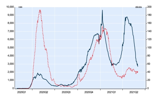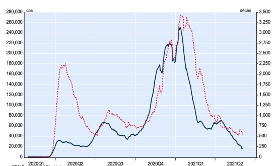 Nouveaux cas en bleu chiffres à gauche - Nouveaux décès en rouge chiffres à droite Vaccination : 2,05 millard de doses de vaccin injectées (+30 millions de doses injectées en 24h mis à jour 3 juin 2021 dernières données disponibles). TOP 5 des pays ayant le plus de cas actifs : (moins décès et guérisons) 1er - USA : 5,537,566 cas, (-19,208 en 24h), la veille (+28,610) 2e* - Inde : 1,635,976 cas (-77,413 en 24h), la veille (-80,244) 3e* - Brésil : 1,104,705 cas (-20,660 en 24h), la veille (-8,069) 4e* - Argentine 366,137 cas (+5,290 en 24h), la veille (+3,778) avance d’une place 5e* - Iran : 355,535 cas (-7,985 en 24h), la veille (-2,380) TOP 5 des pays ayant le plus de décès : 1er - USA : 611,611 décès (+591 en 24h), la veille (+584) 2e* - Brésil : 469,784 décès (+2,078 en 24h), la veille (+2,394) 3e* - Inde : 340,719 décès (+2,706 en 24h), la veille (+2,899) 4e* - Mexique : 228,362 décès (+216 en 24h), la veille (4,578 en 48h) 5e* - Pérou : 185,380 décès (+438 en 24h), la veille (entre dans le TOP 5) TOP 5 des pays ayant le plus grand nombre de guérisons : 1er - USA : 28,025,575 guérisons (+39,064 en 24h), taux de guérison 82,00% (+) 2e* - Inde : 26,597,655 guérisons (+207,071 en 24h), taux de guérison 93,08% (+) 3e* - Brésil : 15,228,983 guérisons (+60,653 en 24h), taux de guérison 90,63% (-) 4e* - France : 5,378,370 personnes (+6,469 en 24h), taux de guérison 94,45% (-) 5e* - Turquie : 5,139,993 personnes (+8,540 en 24h), taux de guérison 97,52% (=) DIASPORA : États-Unis : *Cas depuis le premier cas (9 mars 2020) : 34,174,752 cas (+20,447 en 24h), la veille (+17,567) *Guérisons : 28,025,575 guérisons (+39,064 en 24h), la veille (+45,593) Taux national de Guérison : 82,00% (+) *Décès : 611,611 décès (+591 en 24h), la veille (+584) *Cas actifs (moins décès et guérisons) : 5,537,566 cas, (-19,208 en 24h), la veille (+28,610) Canada : *Cas depuis le début de l’épidémie (25 janvier 2020) : 1,387,445 cas (+2,167 en 24h), la veille (+2,063) *Guérisons : 1,334,011 personnes (+3,622 en 24h, la veille (+3,904) Taux national de Guérison : 96,14% (+) *Décès : 25,644 décès (+32 en 24h), la veille (+46) Taux national de mortalité : 1,84% (=) *Cas actifs : (excluant décès et guérisons) 27,790 (-1,487 en 24h), la veille (-1,887) Vaccination : 24,93 millions de doses de vaccin injectées depuis le 14 décembre 2020 date de la première injection au Canada (+410,000 doses injectées en 24h mis à jour 3 juin 2021 dernières données disponibles). Canada : Nombre de cas confirmés quotidiens