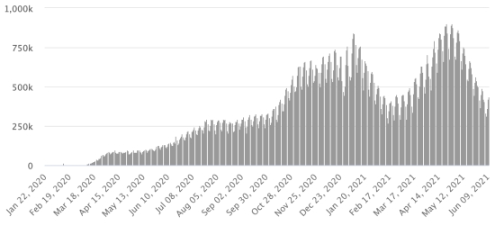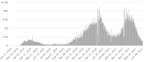 Cas importés : 152 cas depuis la réouverture des aéroports et +43 depuis le dernier bilan datant du 9 juillet 2020 (109 cas) https://www.haitilibre.com/article-31348-haiti-flash-152-cas-importes-depuis-la-reouverture-des-aeroports.html (Depuis, ces informations ne sont plus rendues disponibles) Cas testés depuis le début de la pandémie : 78,029 cas (+546 en 24h) mise à jour 6 juin 2021 (dernières données disponibles). Notez que le très faible nombre de personnes testées ne permet pas statistiquement de faire une estimation représentative des cas de Covid-19 en Haïti. À titre de comparaison, nos voisins dominicains on réalisé au total en date du 8 juin 2021 plus de 1,6 million de tests (1,601,470) Cas confirmés par département : Ouest : 11,553 (+61) Nord : 964 (+1) Centre : 837 (+13) Artibonite : 784 (inchangé) Nord-Est : 446 (+1) Sud-Est : 375 (+2) Sud : 351 (inchangé) Nord-Ouest : 303 (inchangé) Grand'Anse : 297 (inchangé) Nippes : 169 (inchangé) ÉTATS-UNIS : Situation épidémiologique : États-Unis : *Cas depuis le premier cas (9 mars 2020) : 34,275,783 cas (+11,056 en 24h), la veille (+21,861) *Guérisons : 28,278,394 guérisons (+24,303 en 24h), la veille (+33,228) Taux national de Guérison : 82,50% (+) *Décès : 614,007 décès (+513 en 24h), la veille (+442) Taux national de mortalité : 1,79% (=) *Cas actifs (moins décès et guérisons) : 5,383,382 cas, (-13,760 en 24h), la veille (-11,809) *Tests : (491,878,084) personnes testées depuis le premier cas. USA : Nombre de cas confirmés quotidiens :