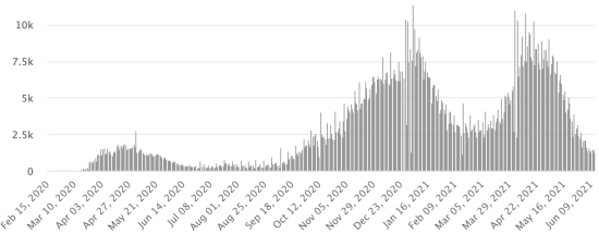 Cas importés : 152 cas depuis la réouverture des aéroports et +43 depuis le dernier bilan datant du 9 juillet 2020 (109 cas) https://www.haitilibre.com/article-31348-haiti-flash-152-cas-importes-depuis-la-reouverture-des-aeroports.html (Depuis, ces informations ne sont plus rendues disponibles) Cas testés depuis le début de la pandémie : 78,419 cas (+390 en 24h) mise à jour 7 juin 2021 (dernières données disponibles). Notez que le très faible nombre de personnes testées ne permet pas statistiquement de faire une estimation représentative des cas de Covid-19 en Haïti. À titre de comparaison, nos voisins dominicains on réalisé au total en date du 10 juin 2021 plus de 1,6 million de tests (1,612,174) Cas confirmés par département : Ouest : 11,642 (+89) Nord : 966 (+2) Centre : 842 (+5) Artibonite : 786 (+2) Nord-Est : 453 (+7) Sud-Est : 377 (+2) Sud : 357 (+6) Nord-Ouest : 303 (inchangé) Grand'Anse : 307 (+10) Nippes : 173 (+4) ÉTATS-UNIS : Situation épidémiologique : États-Unis : *Cas depuis le premier cas (9 mars 2020) : 34,315,873 cas (+9,427 en 24h), la veille (+30,663) *Guérisons : 28,381,623 guérisons (+35,299 en 24h), la veille (+67,930) Taux national de Guérison : 82,70% (+) *Décès : 614,955 décès (+217 en 24h), la veille (+731) Taux national de mortalité : 1,79% (=) *Cas actifs (moins décès et guérisons) : 5,319,295 cas, (-26,089 en 24h), la veille (-37,998) *Tests : 493,894,853 personnes testées depuis le premier cas. USA : Nombre de cas confirmés quotidiens :