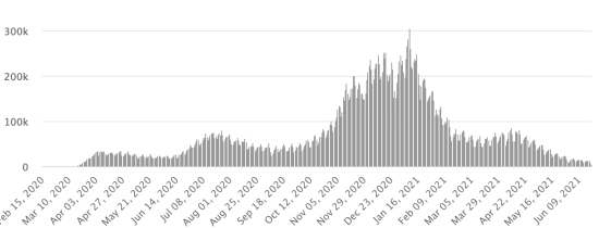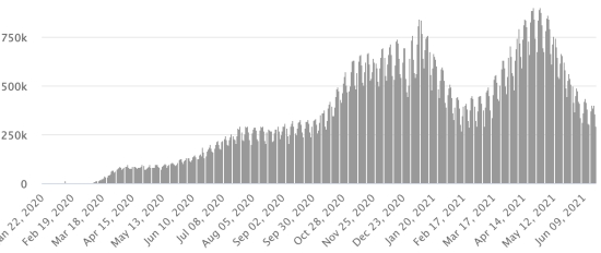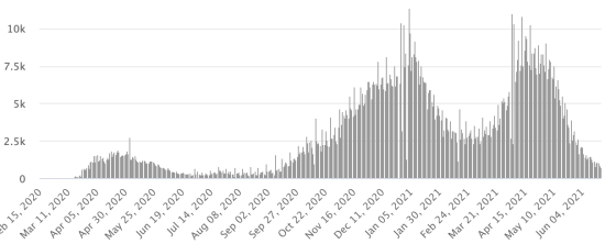 Cas importés : 152 cas depuis la réouverture des aéroports et +43 depuis le dernier bilan datant du 9 juillet 2020 (109 cas) https://www.haitilibre.com/article-31348-haiti-flash-152-cas-importes-depuis-la-reouverture-des-aeroports.html (Depuis, ces informations ne sont plus rendues disponibles) Cas testés depuis le début de la pandémie : 83,287 cas (+490 en 24h) mise à jour 16 juin 2021 (dernières données disponibles). Notez que le très faible nombre de personnes testées ne permet pas statistiquement de faire une estimation représentative des cas de Covid-19 en Haïti. À titre de comparaison, nos voisins dominicains on réalisé au total en date du 18 juin 2021 plus de 1,66 million de tests (1,662,425) Cas confirmés par département : Ouest : 12,479 (+77) Nord :1,012 (+3) Centre : 900 (+15) Artibonite : 813 Nord-Est : 484 Sud-Est : 403 (+5) Sud : 438 (+31) Nord-Ouest : 311 Grand'Anse : 343 (+1) Nippes : 188 ÉTATS-UNIS : Situation épidémiologique : États-Unis : *Cas depuis le premier cas (9 mars 2020) : 34,406,001 cas (+4,289 en 24h), la veille (+8,443) *Guérisons : 28,711,315 guérisons (+16,472 en 24h), la veille (+18,914) Taux national de Guérison : 83,44% (+) *Décès : 617,166 décès (+83 en 24h), la veille (+163) Taux national de mortalité : 1,79% (=) *Cas actifs (moins décès et guérisons) : 5,077,520 cas, (-12,266 en 24h), la veille (-10,634) *Tests : 499,061,725 personnes testées depuis le premier cas. USA : Nombre de cas confirmés quotidiens :