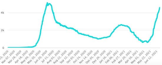 Cas actifs : (moins décès et guérisons) 4,564 cas (+245 en 48h), précédent (+98 en 24h) Haïti : Nombre de cas actifs depuis le début de la pandémie :
