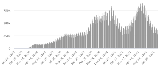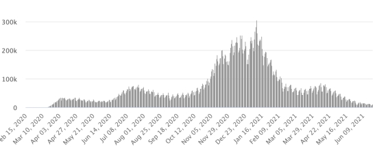 Cas testés depuis le début de la pandémie : 85,122 cas (+1,835 en 48h) mise à jour 18 juin 2021 (dernières données disponibles). Notez que le très faible nombre de personnes testées ne permet pas statistiquement de faire une estimation représentative des cas de Covid-19 en Haïti. À titre de comparaison, nos voisins dominicains on réalisé au total en date du 20 juin 2021 plus de 1,66 million de tests (1,667,342) Cas confirmés par département : Ouest : 12,688 (+209) Nord :1,017 (+5) Centre : 912 (+12) Artibonite : 829 (+16) Nord-Est : 499 (+15) Sud-Est : 415 (+11) Sud : 460 (+22) Nord-Ouest : 321 (+10) Grand'Anse : 371 (+28) Nippes : 199 (+11) ÉTATS-UNIS : Situation épidémiologique : États-Unis : *Cas depuis le premier cas (9 mars 2020) : 34,434,803 cas (+14,965 en 24h), la veille (+13,837) *Guérisons : 28,817,134 guérisons (+49,627 en 24h), la veille (+56,192) Taux national de Guérison : 83,68% (+) *Décès : 617,875 décès (+412 en 24h), la veille (+297) Taux national de mortalité : 1,79% (=) *Cas actifs (moins décès et guérisons) : 4,999,794 cas, (-35,074 en 24h), la veille (-42,652) *Tests : 500,790,852 personnes testées depuis le premier cas. USA : Nombre de cas confirmés quotidiens :