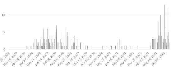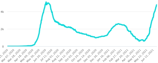 Selon le Ministère de la Santé Publique, 171 nouveaux cas et 6 décès en 48h (6 Dept. Ouest) ont été confirmés en Haïti les 20 et 21 juin 2021 (dernières données partielles disponibles) pour un total de 18,073 cas et 404 décès depuis le début de la pandémie dont 35% lors de la 3e vague en cours. 3e vague : En date du 21 juin 2021 le total de la 3e vague (début 10 mai 2021) s’élève à 4,702 cas confirmés (+3,77%) et 140 décès (+4,47%). À titre de référence au mois d’avril 2021 précédent le début de la 3e vague de Covid le bilan pour le mois s’élevait à 267 nouveaux cas et 9 morts.. Cas confirmés par département : Ouest : 12,864 (+70) Nord :1,025 (+6) Centre : 926 (+14) Artibonite : 884 (+20) Nord-Est : 517 (+1) Sud-Est : 429 (+14) Sud : 483 (+21) Nord-Ouest : 337 (+10) Grand'Anse : 404 (+13) Nippes : 204 (+2) Situation 2021 : Dans le Département de l’Ouest les principales communes touchées sont : Delmas 1,665 cas (+101), Petion ville 1,414 cas (+7), Port-au-Prince 851 cas (+11), Tabarre 686 cas (+16), Croix-des-Bouquets 622 cas (+14) et Carrefour 339 cas (+4) Haïti : Nombre de cas actifs depuis le début de la pandémie (moins décès et guérisons) :