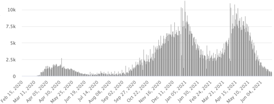 Vaccination : 2,84 millards de doses de vaccin injectées (+50 millions de doses injectées en 24h mis à jour 24 juin 2021 dernières données disponibles). 1 TOP 5 des pays ayant le plus de cas actifs : (moins décès et guérisons) 1er - USA : 4,966,060 cas, (-8,297 en 24h), la veille (-10,049) 2e* - Brésil : 1,263,329 cas (+40,829 en 24h), la veille (+42,597) 3e* - Inde : 595,534 cas (-17,306 en 24h), la veille (-14,184) 4e* - Russie 347,385 cas (indisponible), la veille (+5,768) 5e* - Argentine 292,319 cas (+826 en 24h), la veille (+7,010) TOP 5 des pays ayant le plus de décès : 1er - USA : 619,152 décès (+467 en 24h), la veille (+391) 2e* - Brésil : 511,272 décès (+1,990 en 24h), la veille (+2,042) 3e* - Inde : 394,524 décès (+1,186 en 24h), la veille (+1,324) 4e* - Mexique : 232,346 décès (+278 en 24h), la veille (+221) 5e* - Pérou : 191,447 décès (+161 en 24h), la veille (+213) TOP 5 des pays ayant le plus grand nombre de guérisons : 1er* - Inde : 29,193,085 guérisons (+64,818 en 24h), taux de guérison 96,71% (+) 2e - USA : 28,897,460 guérisons (+25,546 en 24h), taux de guérison 83,80% (+) 3e* - Brésil : 16,548,159 guérisons (+36,458 en 24h), taux de guérison 90,31% (-) 4e* - France : 5,596,777 guérisons (+6,610 en 24h), taux de guérison 97,05% (+) 5e* - Turquie : 5,261,892 guérisons (+7,184 en 24h), taux de guérison 97,46% (+) DIASPORA : États-Unis : *Cas depuis le premier cas (9 mars 2020) : 34,482,672 cas (+17,716 en 24h), la veille (+15,952) *Guérisons : 28,897,460 guérisons (+25,546 en 24h), la veille (+25,610) Taux national de Guérison : 83,80% (+) *Décès : 619,152 décès (+467 en 24h), la veille (+391) *Cas actifs (moins décès et guérisons) : 4,966,060 cas, (-8,297 en 24h), la veille (-10,049) Canada : *Cas depuis le début de l’épidémie (25 janvier 2020) : 1,412,226 cas (+592 en 24h), la veille (+707) *Guérisons : 1,376,904 personnes (+810 en 24h, la veille (+987) Taux national de Guérison : 97,49% (+) *Décès : 26,197 décès (+6 en 24h), la veille (+16) Taux national de mortalité : 1,85% (=) *Cas actifs : (excluant décès et guérisons) 9,125 (-224 en 24h), la veille (+296) *Tests : 36,484,663 personnes testées depuis le premier cas. Vaccination : 34,17 millions de doses de vaccin injectées depuis le 14 décembre 2020 date de la première injection au Canada (+580,000 doses injectées en 24h mis à jour 24 juin 2021 dernières données disponibles). Canada : Nombre de cas confirmé quotidien :