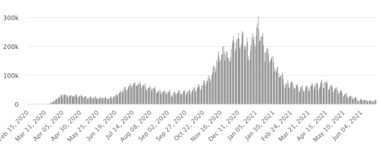 Cas testés depuis le début de la pandémie : 87,360 cas (+824 mise à jour 22 juin 2021 (dernières données disponibles). Notez que le très faible nombre de personnes testées ne permet pas statistiquement de faire une estimation représentative des cas de Covid-19 en Haïti. À titre de comparaison, nos voisins dominicains on réalisé au total en date du 23 juin 2021 plus de 1,68 million de tests (1,685,706) Cas confirmés par département : Ouest : 12,926 (+62) Nord :1,052 (+27) Centre : 930 (+4) Artibonite : 890 (+6) Nord-Est : 524 (+7) Sud-Est : 434 (+5) Sud : 504 (+21) Nord-Ouest : 337 Grand'Anse : 410 (+6) Nippes : 205 (+1) ÉTATS-UNIS : Situation épidémiologique : États-Unis : *Cas depuis le premier cas (9 mars 2020) : 34,482,672 cas (+17,716 en 24h), la veille (+15,952) *Guérisons : 28,897,460 guérisons (+25,546 en 24h), la veille (+25,610) Taux national de Guérison : 83,80% (+) *Décès : 619,152 décès (+467 en 24h), la veille (+391) Taux national de mortalité : 1,79% (=) *Cas actifs (moins décès et guérisons) : 4,966,060 cas, (-8,297 en 24h), la veille (-10,049) *Tests : 503,006,392 personnes testées depuis le premier cas. USA : Nombre de cas confirmé quotidien :