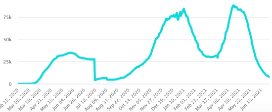 Vaccination : 3 millards de doses de vaccin injectées (+40 millions de doses injectées en 24h mis à jour 28 juin 2021 dernières données disponibles). 1 TOP 5 des pays ayant le plus de cas actifs : (moins décès et guérisons) 1er - USA : 4,900,140 cas, (-29,052 en 24h), la veille (-18,726) 2e* - Brésil : 1,218,050 cas (-42,821 en 24h), la veille (-32,191) 3e* - Inde : 537,034 cas (-15,594 en 24h), la veille (-20,335) 4e* - Russie 378,992 cas (-71,216 en 48h), la veille (+5,267) 5e* - Royaume-Uni : 325,105 cas (+17,329 en 24h), la veille (+19,956 en 24h) TOP 5 des pays ayant le plus de décès : 1er - 619,980 décès (+385 en 24h), la veille (+171) 2e* - Brésil : 516,119 décès (+1,917 en 24h), la veille (+658) 3e* - Inde : 398,484 décès (+816 en 24h), la veille (+907) 4e* - Mexique : 232,803 décès (+195 en 24h), la veille (+44) 5e* - Pérou : 192,163 décès (indisponible), la veille (+264) TOP 5 des pays ayant le plus grand nombre de guérisons : 1er* - Inde : 29,366,601 guérisons (+60,729 en 24h), taux de guérison 96,91% (+) 2e - USA : 29,007,373 guérisons (+44,524 en 24h), taux de guérison 84,01% (+) 3e* - Brésil : 16,673,329 guérisons (+105,807 en 24h), taux de guérison 90,63% (+) 4e* - France : 5,614,468 guérisons (+5,501 en 24h), taux de guérison 97,25% (+) 5e* - Turquie : 5,280,558 guérisons (+6,536 en 24h), taux de guérison 97,54% (+) DIASPORA : États-Unis : *Cas depuis le premier cas (9 mars 2020) : 34,527,493 cas (+15,857 en 24h), la veille (+16,959) *Guérisons : 29,007,373 guérisons (+44,524 en 24h), la veille (+35,514) Taux national de Guérison : 84,01% (+) *Décès : 619,980 décès (+385 en 24h), la veille (+171) *Cas actifs (moins décès et guérisons) : 4,900,140 cas, (-29,052 en 24h), la veille (-18,726) Canada : *Cas depuis le début de l’épidémie (25 janvier 2020) : 1,414,736 cas (+602 en 24h), la veille (+931) *Guérisons : 1,381,056 personnes (+948 en 24h, la veille (+1,758) Taux national de Guérison : 97,61% (+) *Décès : 26,273 décès (+35 en 24h), la veille (+11) Taux national de mortalité : 1,85% (=) *Cas actifs : (excluant décès et guérisons) 7,407 cas (-381 en 24h), la veille (-838) *Tests : 36,705,571 personnes testées depuis le premier cas. Vaccination : 36,2 millions de doses de vaccin injectées depuis le 14 décembre 2020 date de la première injection au Canada (+700,000 doses injectées en 24h mis à jour 28 juin 2021 dernières données disponibles). Canada : Nombre de cas actifs depuis le début de la pandémie :