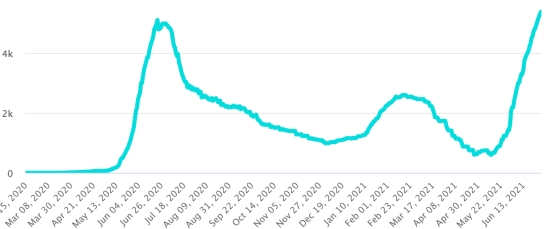Cas actifs : (moins décès et guérisons) 5,375 cas (+175 en 48h), précédent (+98 en 24h) Haïti : Nombre de cas actifs depuis le début de la pandémie :