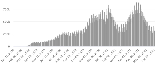 Cas testés depuis le début de la pandémie : 89,785 cas (+1,128 en 48h mise à jour 26 juin 2021 (dernières données disponibles). Notez que le très faible nombre de personnes testées ne permet pas statistiquement de faire une estimation représentative des cas de Covid-19 en Haïti. Cas confirmés par département : Ouest : 13,195 (+149) Nord :1,060 Centre : 961 (+3) Artibonite : 935 (+21) Nord-Est : 527 (+1) Sud-Est : 459 (+10) Sud : 540 (+8) Nord-Ouest : 339 (+1) Grand'Anse : 432 (+4) Nippes : 210 (+1) ÉTATS-UNIS : Situation épidémiologique : États-Unis : *Cas depuis le premier cas (9 mars 2020) : 34,540,845 cas (+13,352 en 24h), la veille (+15,857) *Guérisons : 29,026,688 guérisons (+19,315 en 24h), la veille (+44,524) Taux national de Guérison : 84,03% (+) *Décès : 620,249 décès (+269 en 24h), la veille (+385) Taux national de mortalité : 1,79% (=) *Cas actifs (moins décès et guérisons) : 4,893,908 cas, (-6,232 en 24h), la veille (-29,052) *Tests : 506,159,128 personnes testées depuis le premier cas. USA : Nombre de cas confirmé quotidien :