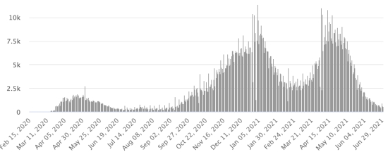 Vaccination : 3,04 millards de doses de vaccin injectées (+40 millions de doses injectées en 24h mis à jour 29 juin 2021 dernières données disponibles). 1 TOP 5 des pays ayant le plus de cas actifs : (moins décès et guérisons) 1er - USA : 4,893,908 cas, (-6,232 en 24h), la veille (-29,052) 2e* - Brésil : 1,182,286 cas (-35,764 en 24h), la veille (-42,821) 3e* - Inde : 523,241 cas (-13,793 en 24h), la veille (-15,594) 4e* - Russie 384,935 cas (+5,943 en 48h), la veille (+71,216) 5e* - Royaume-Uni : 347,891 cas (+22,786 en 24h), la veille (+17,329) TOP 5 des pays ayant le plus de décès : 1er - USA : 620,249 décès (+269 en 24h), la veille (+385) 2e* - Brésil : 518,246 décès (+2,127 en 24h), la veille (+1,917) 3e* - Inde : 399,475 décès (+991 en 24h), la veille (+816) 4e* - Mexique : 233,047 décès (+244 en 24h), la veille (+195) 5e* - Pérou : 192,331 décès (+168 en 48h), la veille (indisponible) TOP 5 des pays ayant le plus grand nombre de guérisons : 1er* - Inde : 29,488,918 guérisons (+122,317 en 24h), taux de guérison 96,96% (+) 2e - USA : 29,026,688 guérisons (+19,315 en 24h), taux de guérison 84,03% (+) 3e* - Brésil : 16,858,632 guérisons (+185,303 en 24h), taux de guérison 90,83% (+) 4e* - France : 5,618,885 guérisons (+4,417 en 24h), taux de guérison 97,29% (+) 5e* - Turquie : 5,294,285 guérisons (+13,727 en 24h), taux de guérison 97,57% (+) DIASPORA : États-Unis : *Cas depuis le premier cas (9 mars 2020) : 34,540,845 cas (+13,352 en 24h), la veille (+15,857) *Guérisons : 29,026,688 guérisons (+19,315 en 24h), la veille (+44,524) Taux national de Guérison : 84,03% (+) *Décès : 620,249 décès (+269 en 24h), la veille (+385) *Cas actifs (moins décès et guérisons) : 4,893,908 cas, (-6,232 en 24h), la veille (-29,052) Canada : *Cas depuis le début de l’épidémie (25 janvier 2020) : 1,415,284 cas (+548 en 24h), la veille (+602) *Guérisons : 1,381,902 personnes (+846 en 24h, la veille (+948) Taux national de Guérison : 97,64% (+) *Décès : 26,295 décès (+22 en 24h), la veille (+35) Taux national de mortalité : 1,85% (=) *Cas actifs : (excluant décès et guérisons) 7,087 cas (-320 en 24h), la veille (-381) *Tests : 36,768,392 personnes testées depuis le premier cas. Vaccination : 36,78 millions de doses de vaccin injectées depuis le 14 décembre 2020 date de la première injection au Canada (+580,000 doses injectées en 24h mis à jour 29 juin 2021 dernières données disponibles). Canada : Nombre de cas confirmé quotidien :