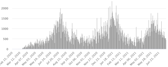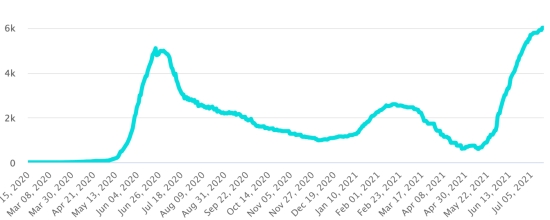 Communes les plus touchées dans l’Ouest (2021) : Delmas : 1,779 (+5) ; Pétion ville 1,582 (+4) ; Port-au-Prince 979 (+2) ; Tabarre 762 (+3) ; Croix-des-Bouquets 711 (+3) ; Carrefour 361 (+0) Cas testés depuis le début de la pandémie : 95,430 cas (+221 en 24h mise à jour 10 juillet 2021 (dernières données disponibles). Notez que le très faible nombre de personnes testées ne permet pas statistiquement de faire une estimation représentative des cas de Covid-19 en Haïti. Cas confirmés par département (2021) : Ouest : 6,707 (2020 : 6,945) Nord : 421 (2020 : 677) Centre : 513 (2020 : 508) Artibonite : 423 (2020 : 593) Nord-Est : 227 (2020 : 314) Sud-Est : 226 (2020 : 274) Sud : 367 (2020 : 262) Nord-Ouest : 141 (2020 : 229) Grand'Anse : 298 (2020 : 176) Nippes : 97 (2020 : 149) Décès cumulés par département (2021) : Ouest : 164 (2020 : 104) Nord : 28 (2020 : 34) Centre : 15 (2020 : 13) Artibonite : 10 (2020 : 39) Nord-Est : 3 (2020 : 6) Sud : 25 (2020 : 6) Sud-Est : 6 (2020 : 9) Nord-Ouest : 5 (2020 : 12) Grand'Anse : 1 (2020 : 13) Nippes : 10 (2020 : 5) Répartition des décès par âge (2020 et 2021) : 0-9 ans : 12 10-19 ans : 6 20-29 ans : 20 30-39 ans : 31 40-49 ans : 54 50-59 ans : 90 (+2) 60-69 ans : 106 (+3) 70-79 ans : 111 (+1) 80 ans et plus : 78 (+1) Vaccination : 38 doses injectées le vendredi 16 juillet https://www.haitilibre.com/article-34253-haiti-covid-premieres-injections-de-vaccins.html DIASPORA : Situation épidémiologique : USA : *Cas depuis le premier cas (9 mars 2020) : 34,953,937 cas (+24,081 en 24h), la veille (+42,701) *Guérisons : 29,369,181 guérisons (+10,650 en 24h), la veille (+16,618) Taux national de Guérison : 84,02% (-) *Décès : 624,715 décès (+109 en 24h), la veille (+392) Taux national de mortalité : 1,78% (=) *Cas actifs (moins décès et guérisons) : 4,960,041 cas, (+13,322 en 24h), la veille (+25,691) *Tests : 516,277,662 personnes testées depuis le premier cas. USA : Nombre de cas confirmé quotidien :