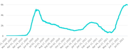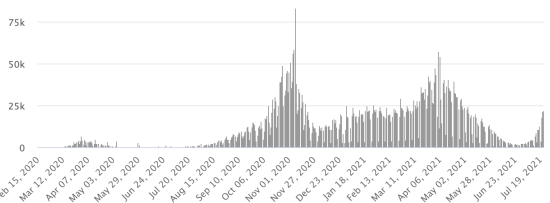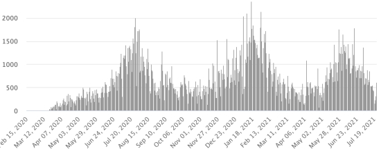 Vaccination : 339,76 millions de doses de vaccin injectées depuis le 14 décembre 2020 date de la première injection aux États-Unis (660,000 doses injectées, en 24h). Mise à jour 22 juillet 2021 dernières données disponibles). RÉPUBLIQUE DOMINICAINE : Cas confirmés depuis le 1er mars 2020 : 338,902 cas (+611 en 24h) la veille (+316). Premier cas (1er mars 2020) https://www.haitilibre.com/article-30165-haiti-flash-premier-cas-de-covid-19-en-republique-dominicaine.html Guérisons : 287,607 guérisons depuis le 1er mars (+4,766 en 24h), la veille (+2,196) Taux national de Guérison : 84,86% (+) Décès : 3,931 décès (+2 en 24h), la veille (+1) Taux de mortalité : 1,15% (-) Cas actifs : (excluant décès et guérisons) 47,364 cas (-4,157 en 24h) la veille (-1,881) République Dominicaine : Nombre de cas confirmés quotidiens :