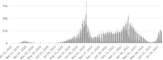 Communes les plus touchées dans l’Ouest (2021) : Delmas : 1,840 (+2) ; Pétion ville 1,622 (+4) ; Port-au-Prince 1,027 (+4) ; Tabarre 797 (+6) ; Croix-des-Bouquets 775 (+12) Cas testés depuis le début de la pandémie : 101,348 cas (+863 en 48h mise à jour 29 juillet 2021 (dernières données disponibles). Notez que le très faible nombre de personnes testées ne permet pas statistiquement de faire une estimation représentative des cas de Covid-19 en Haïti. Cas confirmés par département (2021) : Ouest : 7,023 (2020 : 6,945) Nord : 434 (2020 : 677) Centre : 567 (2020 : 508) Artibonite : 484 (2020 : 593) Nord-Est : 255 (2020 : 314) Sud-Est : 287 (2020 : 274) Sud : 455 (2020 : 262) Nord-Ouest : 202 (2020 : 229) Grand'Anse : 354 (2020 : 176) Nippes : 119 (2020 : 149) Décès cumulés par département (2021) : Ouest : 181 (2020 : 104) Nord : 29 (2020 : 34) Centre : 22 (2020 : 13) Artibonite : 17 (2020 : 39) Nord-Est : 4 (2020 : 6) Sud : 30 (2020 : 6) Sud-Est : 10 (2020 : 9) Nord-Ouest : 7 (2020 : 12) Grand'Anse : 5 (2020 : 13) Nippes : 14 (2020 : 5) Répartition des décès par âge (2020 et 2021) : 0-9 ans : 13 10-19 ans : 6 20-29 ans : 21 30-39 ans : 34 40-49 ans : 57 50-59 ans : 96 60-69 ans : 121 (+1) 70-79 ans : 128 (+1) 80 ans et plus : 84 Vaccination : 8,107 (+1,531 en 3 jours) doses de vaccin « Spikevax » (appellation officielle depuis le 21 juin 2021) du Laboratoire MODERNA ont été injectés au total depuis le 16 juillet 2021, date de la première injection https://www.haitilibre.com/article-34253-haiti-covid-premieres-injections-de-vaccins.html . Mise à jour 2 août juillet 2021, dernières données disponibles. Liste des Centres de vaccinations : en date du 31 juillet DIASPORA : Situation épidémiologique : USA : *Cas depuis le premier cas (9 mars 2020) : 35,895,980 cas (+127,056 en 24h), la veille (+23,900) *Guérisons : 29,717,537 guérisons (+44,247 en 24h), la veille (+7,173) Taux national de Guérison : 82,78% (-) *Décès : 629,862 décès (+482 en 24h), la veille (+65) Taux national de mortalité : 1,75% (=) *Cas actifs (moins décès et guérisons) : 5,548,581 cas, (+82,327 en 24h), la veille (+16,662) *Tests : 532,141,068 personnes testées depuis le premier cas. USA : Nombre de cas confirmé quotidien :