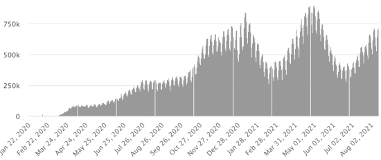 SITUATION MONDIALE : Situation épidémiologique : Vendredi 13 août 2021 le nombre de personnes contaminées dans le monde par le coronavirus Covid-19 depuis le début de la pandémie (Source officielle), s’élève à 206,317,768 cas (+685,887 en 24h), la veille (+1,420,695 en 48h) Nombre de pays contaminés : 192 *Guérisons : 185,145,350 personnes ont été guéries du Covid-19 dans le monde (+512,527 en 24h), la veille (+1,237,818 en 48h) *Décès : 4,349,493 personnes sont mortes du Covid-19 dans le monde (+9,240 en 24h), la veille (+22,796 en 48h) *Cas actifs (moins décès et guérisons) dans le monde est actuellement de 16,822,925 cas (+164,120 en 24h), la veille (+160,081 en 48h) Taux moyen de guérison au monde : 89,73% (-) Taux moyen de mortalité au monde : 2,10% (-) Monde : Nombre de cas confirmés quotidiens :