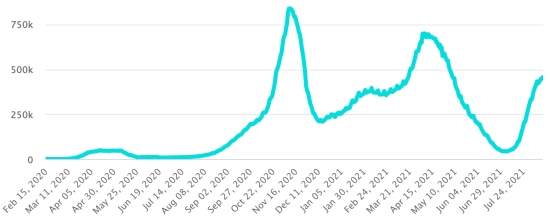 SITUATION MONDIALE : Situation épidémiologique : Dimanche 15 août 2021 le nombre de personnes contaminées dans le monde par le coronavirus Covid-19 depuis le début de la pandémie (Source officielle), s’élève à 207,584,240 cas (+539,780 en 24h), la veille (+726,692) Nombre de pays contaminés : 192 *Guérisons : 186,071,552 personnes ont été guéries du Covid-19 dans le monde (+422,334 en 24h), la veille (+503,868) *Décès : 4,368,519 personnes sont mortes du Covid-19 dans le monde (+8,814 en 24h), la veille (+10,212) *Cas actifs (moins décès et guérisons) dans le monde est actuellement de 17,144,169 cas (+108,632 en 24h), la veille (+212,612) Taux moyen de guérison au monde : 89,63% (-) Taux moyen de mortalité au monde : 2,10% (=) Monde : Nombre de cas confirmés quotidiens :