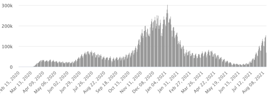 Vaccination : 4,7 millards de doses de vaccin injectées (+40 millions de doses injectées en 24h mis à jour 14 août 2021 dernières données disponibles). HAÏTI : Situation épidémiologique : Avertissement : Le Ministère de la Santé Publique et de la Population (MSPP) n’as pas rendu disponible après le 7 août 2021 les données quotidiennes sur la situation du Covid-19 en Haïti En conséquence, les données ci-dessous sur la situation en Haïti sont les dernières disponibles. Selon le Ministère de la Santé Publique, 49 nouveaux cas de Covid-19 et de ses variants auraient été confirmés en Haïti les 6 et 7 août 2021 (dernières données partielles disponibles) pour un total de 20,556 cas confirmés sur l’ensemble du territoire national (46.1% de femmes et 53.9% hommes), depuis le premier cas (19 mars 2020 https://www.haitilibre.com/article-30319-haiti-sante-origine-des-2-premiers-cas-de-covid-19-en-haiti.html ). Précédente mise à jour (74 cas les 4 et 5 août). 3ème vague : En date du 7 août 2021 le total de la 3ème vague (début 10 mai 2021) s’élève à 7,251 cas confirmés et 305 décès. Guérisons : 16,004 (+345 ) Taux de guérison : 77,85% (+) Décès : 576 décès +0 Taux de mortalité : 2,80% (=) Haïti : Tendance des décès :