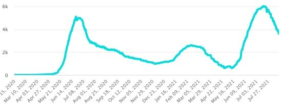 Vaccination : 4,84 millards de doses de vaccin injectées (+40 millions de doses injectées en 24h mis à jour 18 août 2021 dernières données disponibles). HAÏTI : Situation épidémiologique : Selon le Ministère de la Santé Publique, 31 nouveaux cas en 24h de Covid-19 et de ses variants auraient été confirmés en Haïti le 12 août 2021 (dernières données partielles disponibles) pour un total de 20,689 cas confirmés sur l’ensemble du territoire national (46.1% de femmes et 53.9% hommes), depuis le premier cas (19 mars 2020 https://www.haitilibre.com/article-30319-haiti-sante-origine-des-2-premiers-cas-de-covid-19-en-haiti.html ). Précédente mise à jour (73 cas les 10-11 août). 3ème vague : Le total de la 3ème vague (début 10 mai 2021) s’élève à 7,383 cas confirmés et 311 décès.. Mise à jour 12 août 2021. Guérisons : 16,498 (+83 en 24h) Taux de guérison : 79,74% (+) Décès : 582 décès +2 (+1 Ouest +1 Artibonite) Taux de mortalité : 2,81% (+) Haïti : Tendance des décès :