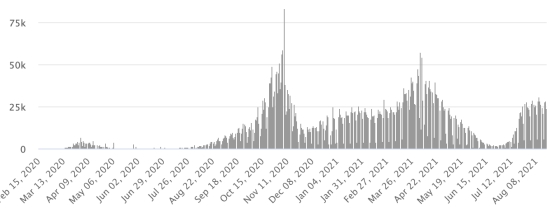 SITUATION MONDIALE : Situation épidémiologique : Vendredi 20 août 2021 le nombre de personnes contaminées dans le monde par le coronavirus Covid-19 depuis le début de la pandémie (Source officielle), s’élève à 210,978,995 cas (+772,214 en 24h), la veille (+780,831) Nombre de pays contaminés : 192 *Guérisons : 188,885,279 personnes ont été guéries du Covid-19 dans le monde (+582,202 en 24h), la veille (+596,695) *Décès : 4,419,600 personnes sont mortes du Covid-19 dans le monde (+12,467 en 24h), la veille (+11,795) *Cas actifs (moins décès et guérisons) dans le monde est actuellement de 17,674,116 cas (+177,471 en 24h), la veille (+172,341) Taux moyen de guérison au monde : 89,52% (-) Taux moyen de mortalité au monde : 2,09% (=) Monde : Nombre de cas confirmés quotidiens :