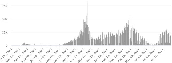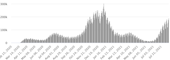 Cas testés depuis le début de la pandémie : 107,968 cas (+188 en 24h) mise à jour 21 août 2021 dernières données disponibles. Notez que le très faible nombre de personnes testées ne permet pas statistiquement de faire une estimation représentative des cas actifs de Covid-19 en Haïti. À titre de comparaison la République voisine a réalisé près de 2 millions de tests sur sa population depuis le début de l’épidémie. Communes les plus touchées dans l’Ouest (2021) : Delmas : 1,895 (+2) ; Pétion ville 1,659 (+0) ; Port-au-Prince 1,053 (+1) ; Tabarre 830 (+1) ; Croix-des-Bouquets 820 (+1) Cas confirmés par département (2021) : Ouest : 7,258 (2020 : 6,945) Nord : 454 (2020 : 677) Centre : 648 (2020 : 508) Artibonite : 529 (2020 : 593) Nord-Est : 276 (2020 : 314) Sud-Est : 317 (2020 : 274) Sud : 479 (2020 : 262) Nord-Ouest : 236 (2020 : 229) Grand'Anse : 384 (2020 : 176) Nippes : 142 (2020 : 149) Décès cumulés par département (2021) : Ouest : 194 (2020 : 104) Nord : 30 (2020 : 34) Centre : 25 (2020 : 13) Artibonite : 20 (2020 : 39) Nord-Est : 4 (2020 : 6) Sud : 32 (2020 : 6) Sud-Est : 11 (2020 : 9) Nord-Ouest : 7 (2020 : 12) Grand'Anse : 5 (2020 : 13) Nippes : 15 (2020 : 5) Répartition des décès par âge (depuis le début de l’épidémie) : 0-9 ans : 13 10-19 ans : 6 20-29 ans : 22 30-39 ans : 35 40-49 ans : 61 50-59 ans : 99 60-69 ans : 127 70-79 ans : 132 80 ans et plus : 89 Vaccination : 28,736 (+1,665 en 48h) doses de vaccin « Spikevax » (appellation officielle depuis le 21 juin 2021) du Laboratoire MODERNA ont été injectés au total depuis le 16 juillet 2021, date de la première injection . 3,360 personnes sont entièrement vaccinées avec 2 doses. Mise à jour 25 août 2021, dernières données disponibles. Liste des 51 Centres de vaccination ouverts (et horaires) par département : https://www.icihaiti.com/article-34544-icihaiti-covid-liste-des-51-centres-de-vaccination-ouverts-par-departement.html (mise à jour 20 août 2021) DIASPORA : Situation épidémiologique : USA : *Cas depuis le premier cas (9 mars 2020) : 39,540,401 cas (+198,248 en 24h), la veille (+184,904) *Guérisons : 30,786,368 guérisons (+54,248 en 24h), la veille (+53,837) Taux national de Guérison : 77,86% (-) *Décès : 653,405 décès (+1,449 en 24h), la veille (+2,276) Taux national de mortalité : 1,65% (=) *Cas actifs (moins décès et guérisons) : 8,100,628 cas (+142,551 en 24h), la veille (+128,791) *Tests : 577,474,238 personnes testées depuis le premier cas USA : Nombre de cas confirmé quotidien :
