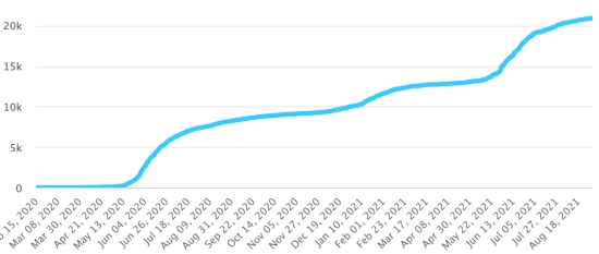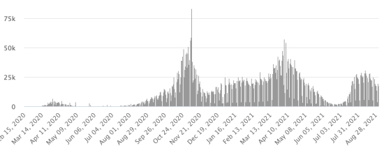 Vaccination : 5,38 millards de doses de vaccin injectées (+50 millions de doses injectées en 24h. Mise à jour 1er septembre 2021 (dernières données disponibles). HAÏTI : Situation épidémiologique : Si l’on en croit le Ministère de la Santé Publique, +25 nouveaux cas en 48h de Covid-19 et de ses variants auraient été confirmés en Haïti les 25 et 26 août 2021 (dernières données partielles disponibles) pour un total de 20,941 cas confirmés sur l’ensemble du territoire national (46.2% de femmes et 53.8% hommes), depuis le premier cas (19 mars 2020 https://www.haitilibre.com/article-30319-haiti-sante-origine-des-2-premiers-cas-de-covid-19-en-haiti.html ). Précédente mise à jour (+20 cas le 24 août). 3ème vague : Le total de la 3ème vague (début 10 mai 2021) s’élève à 7,635 cas confirmés et 315 décès.. Mise à jour 26 août 2021. Guérisons : 18,222 (+182 en 48h) Taux de guérison : 87,01% (+) Décès : 586 décès +0 () Taux de mortalité : 2,79% (-) Haïti : Tendance des décès :