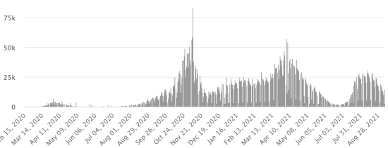 Cas testés depuis le début de la pandémie : 112,578 cas (+192 en 24h) mise à jour 1er septembre 2021 dernières données disponibles. Notez que le très faible nombre de personnes testées ne permet pas statistiquement de faire une estimation représentative des cas actifs de Covid-19 en Haïti. À titre de comparaison la République voisine a réalisé près de 2 millions de tests sur sa population depuis le début de l’épidémie. Communes les plus touchées dans l’Ouest (2021) : Delmas : 1,929 (+4) ; Pétion ville 1,690 (+3) ; Port-au-Prince 1,076 (+1) ; Tabarre 843 (+4) ; Croix-des-Bouquets 843 (+0) Cas confirmés par département (2021) : Ouest : 7,430 (2020 : 6,945) Nord : 461 (2020 : 677) Centre : 662 (2020 : 508) Artibonite : 554 (2020 : 593) Nord-Est : 283 (2020 : 314) Sud-Est : 338 (2020 : 274) Sud : 486 (2020 : 262) Nord-Ouest : 248 (2020 : 229) Grand'Anse : 391 (2020 : 176) Nippes : 144 (2020 : 149) Décès cumulés par département (2021) : Ouest : 195 (2020 : 104) Nord : 30 (2020 : 34) Centre : 25 (2020 : 13) Artibonite : 20 (2020 : 39) Nord-Est : 4 (2020 : 6) Sud : 32 (2020 : 6) Sud-Est : 11 (2020 : 9) Nord-Ouest : 9 (2020 : 12) Grand'Anse : 5 (2020 : 13) Nippes : 16 (2020 : 5) Répartition des décès par âge (depuis le début de l’épidémie) : 0-9 ans : 13 10-19 ans : 6 20-29 ans : 22 30-39 ans : 35 40-49 ans : 62 50-59 ans : 101 60-69 ans : 128 70-79 ans : 132 80 ans et plus : 89 Vaccination : 35,400 (+9,683 en 6 jours) doses de vaccin « Spikevax » (appellation officielle depuis le 21 juin 2021) du Laboratoire MODERNA ont été injectés au total depuis le 16 juillet 2021, date de la première injection. 6,404 personnes sont entièrement vaccinées avec 2 doses. Mise à jour 31 août 2021, dernières données disponibles. Liste des 62 Centres de vaccination ouverts (et horaires) par département : (mise à jour 6 septembre 2021) DIASPORA : Situation épidémiologique : USA : *Cas depuis le premier cas (9 mars 2020) : 41,206,672 cas (+340,878 en 24h), la veille (+60,535) *Guérisons : 31,522,263 guérisons (+186,985 en 24h), la veille (+19,527) Taux national de Guérison : 76,49% (-) *Décès : 669,022 décès (+2,463 en 24h), la veille (+340) Taux national de mortalité : 1,62% (-) *Cas actifs (moins décès et guérisons) : 9,015,387 cas (+151,430 en 24h), la veille (+40,668) *Tests : 597,322,711 personnes testées depuis le premier cas USA : Nombre de cas confirmé quotidien :