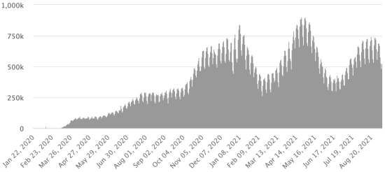 SITUATION MONDIALE : Situation épidémiologique : Mercredi 8 septembre 2021 le nombre de personnes contaminées dans le monde par le coronavirus Covid-19 depuis le début de la pandémie (Source officielle), s’élève à 222,793,280 cas (+761,447 en 24h), la veille (+429,274) Nombre de pays contaminés : 192 *Guérisons : 199,317,213 personnes ont été guéries du Covid-19 dans le monde (+667,823 en 24h), la veille (+541,164) *Décès : 4,600,334 personnes sont mortes du Covid-19 dans le monde (+10,867 en 24h), la veille (+6,484) *Cas actifs (moins décès et guérisons) dans le monde est actuellement de 18,875,733 cas (+82,757 en 24h), la veille (-118,374) Taux moyen de guérison au monde : 89,46% (=) Taux moyen de mortalité au monde : 2,06% (=) Monde : Nombre de cas confirmés quotidiens :