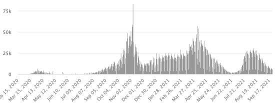 Le total de la 3ème vague (début 10 mai 2021) s’élève à 8,206 cas confirmés et 339 décès.. Mise à jour 19 septembre 2021.