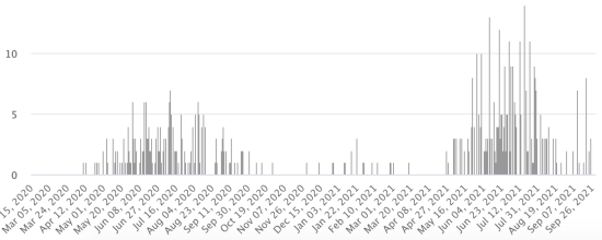 Vaccination : 6,24 millards de doses de vaccin injectées (+40 millions de doses injectées en 24h. Mise à jour 29 septembre 2021 (dernières données disponibles). HAÏTI : Situation épidémiologique : Si l’on en croit le Ministère de la Santé Publique, +118 nouveaux cas en 48h de Covid-19 et de ses variants auraient été confirmés en Haïti les 22 et 23 septembre 2021 (dernières données partielles disponibles) pour un total de 21,761 cas confirmés sur l’ensemble du territoire national (46.3% de femmes et 53.7% hommes), depuis le premier cas (19 mars 2020 https://www.haitilibre.com/article-30319-haiti-sante-origine-des-2-premiers-cas-de-covid-19-en-haiti.html ). Précédente mise à jour (+107 cas les 20-21septembre). Guérisons : 19,532 (+69 en 48h) Taux de guérison : 89,75% (-) Décès : 611 décès +1 en 48h (+1 Sud) Taux de mortalité : 2,80% (-) Haïti : Nombre de décès quotidiens :