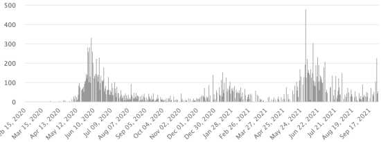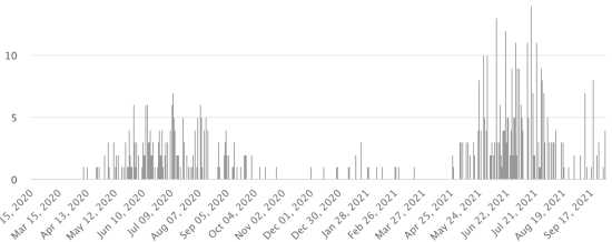 Vaccination : 6,31 millards de doses de vaccin injectées (+10 millions de doses injectées en 24h. Mise à jour 2 octobre 2021 (dernières données disponibles). HAÏTI : Situation épidémiologique : Selon le Ministère de la Santé Publique, +153 nouveaux cas en 48h de Covid-19 et de ses variants auraient été confirmés en Haïti le 27-28 septembre 2021 (dernières données partielles disponibles) pour un total de 22,125 cas confirmés sur l’ensemble du territoire national (46.5% de femmes et 53.5% hommes), depuis le premier cas (19 mars 2020 https://www.haitilibre.com/article-30319-haiti-sante-origine-des-2-premiers-cas-de-covid-19-en-haiti.html ). Précédente mise à jour (+56 cas le 26 septembre). Guérisons : 19,687 (+85 en 48h) Taux de guérison : 88,98% (-) Décès : 622 décès +7 en 48h (Ouest+1, Centre +2, Nord +3, Nord-Est+1) Taux de mortalité : 2,81% (+) Haïti : Nombre de décès quotidiens :
