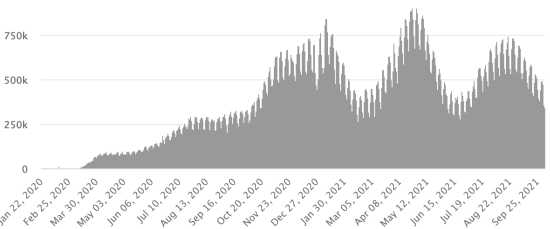 SITUATION MONDIALE : Situation épidémiologique : Mardi 5 octobre 2021 le nombre de personnes contaminées dans le monde par le coronavirus Covid-19 depuis le début de la pandémie (Source officielle), s’élève à 236,228,503 cas (+492,365 en 24h), la veille (+268,349) Nombre de pays contaminés : 221 *Guérisons : 213,284,363 personnes ont été guéries du Covid-19 dans le monde (+667,929 en 24h), la veille (+349,940) *Décès : 4,824,520 personnes sont mortes du Covid-19 dans le monde (+8,237 en 24h), la veille (+3,447) *Cas actifs (moins décès et guérisons) dans le monde est actuellement de 18,119,620 cas (-183,801 en 24h), la veille (-85,038) Taux moyen de guérison au monde : 90,28% (+) Taux moyen de mortalité au monde : 2,04% (=) Monde : Nombre de cas confirmés quotidiens :