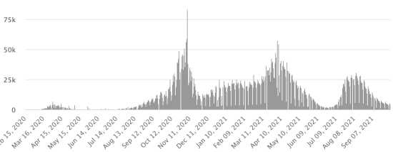Cas testés depuis le début de la pandémie : 123,092 cas (+516 en 24h) mise à jour 1er octobre 2021 dernières données disponibles. Notez que le très faible nombre de personnes testées ne permet pas statistiquement de faire une estimation représentative des cas actifs de Covid-19 en Haïti. Ce qui explique également le faible nombre de cas détecté quotidiennement. À titre de comparaison la République voisine a plus de 2 millions de tests sur sa population depuis le début de l’épidémie. Communes les plus touchées dans l’Ouest (2021) : Delmas : 2,092 (+15) ; Pétion ville 1,748 (+1) ; Port-au-Prince 1,143 (+2) ; Tabarre 924(+22) ; Croix-des-Bouquets 924 (+0) Cas confirmés par département (2021) : Ouest : 7,954 cas (2020 : 6,945 cas) Nord : 534 cas (2020 : 677 cas) Centre : 739 cas (2020 : 508 cas) Artibonite : 616 cas (2020 : 593 cas) Nord-Est : 306 cas (2020 : 314 cas) Sud-Est : 432 cas (2020 : 274 cas) Sud : 625 cas (2020 : 262 cas) Nord-Ouest : 281 cas (2020 : 229 cas) Grand'Anse : 553 cas (2020 : 176 cas) Nippes : 187 cas (2020 : 149 cas) Décès cumulés par département (2021) : Ouest : 210 décès (2020 : 104 décès) Nord : 40 décès (2020 : 34 décès) Centre : 30 décès (2020 : 13 décès) Artibonite : 24 décès (2020 : 39 décès) Nord-Est : 6 décès (2020 : 6 décès) Sud : 35 décès (2020 : 6 décès) Sud-Est : 11 décès (2020 : 9 décès) Nord-Ouest : 12 décès (2020 : 12 décès) Grand'Anse : 5 décès (2020 : 13 décès) Nippes : 18 décès (2020 : 5 décès) Répartition des décès par âge (depuis le début de l’épidémie) : 0-9 ans : 13 décès 10-19 ans : 6 décès 20-29 ans : 24 décès 30-39 ans : 39 décès (+2) 40-49 ans : 67 décès 50-59 ans : 108 décès 60-69 ans : 140décès (+1) 70-79 ans : 139 décès 80 ans et plus : 98 décès (+2) Vaccination : 74,879 (+8,187 en 7 jours) doses de vaccin « Spikevax » (appellation officielle) du Laboratoire MODERNA ont été injectés au total en Haïti depuis le 16 juillet 2021, date de la première injection. 22,432 personnes sont entièrement vaccinées (2 doses). Mise à jour 2 octobre 2021, dernières données disponibles. Liste des 113 Centres de vaccination ouverts en Haïti (et horaires) par département : (mise à jour 5 octobre 2021) DIASPORA : Situation épidémiologique : USA : *Cas depuis le premier cas (9 mars 2020) : 44,918,565 cas (+137,365 en 24h), la veille (+98,365) *Guérisons : 34,392,326 guérisons (+110,205 en 24h), la veille (+127,344) Taux national de Guérison : 76,56% (+) *Décès : 727,710 décès (+2,982 en 24h), la veille (+2,460) Taux national de mortalité : 1,62% (+) *Cas actifs (moins décès et guérisons) : 9,798,529 cas (+21,814), la veille (-31,439) *Tests : 652,389,629 personnes testées depuis le premier cas USA : Nombre de cas confirmés quotidiens :