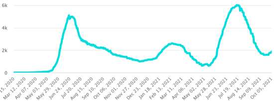 Cas testés depuis le début de la pandémie : 123,092 cas (+516 en 24h) mise à jour 1er octobre 2021 dernières données disponibles. Notez que le très faible nombre de personnes testées ne permet pas statistiquement de faire une estimation représentative des cas actifs de Covid-19 en Haïti. Ce qui explique également le faible nombre de cas détecté quotidiennement. À titre de comparaison la République voisine a plus de 2 millions de tests sur sa population depuis le début de l’épidémie. Communes les plus touchées dans l’Ouest (2021) : Delmas : 2,092 (+15) ; Pétion ville 1,748 (+1) ; Port-au-Prince 1,143 (+2) ; Tabarre 924(+22) ; Croix-des-Bouquets 924 (+0) Cas confirmés par département (2021) : Ouest : 7,954 cas (2020 : 6,945 cas) Nord : 534 cas (2020 : 677 cas) Centre : 739 cas (2020 : 508 cas) Artibonite : 616 cas (2020 : 593 cas) Nord-Est : 306 cas (2020 : 314 cas) Sud-Est : 432 cas (2020 : 274 cas) Sud : 625 cas (2020 : 262 cas) Nord-Ouest : 281 cas (2020 : 229 cas) Grand'Anse : 553 cas (2020 : 176 cas) Nippes : 187 cas (2020 : 149 cas) Décès cumulés par département (2021) : Ouest : 210 décès (2020 : 104 décès) Nord : 40 décès (2020 : 34 décès) Centre : 30 décès (2020 : 13 décès) Artibonite : 24 décès (2020 : 39 décès) Nord-Est : 6 décès (2020 : 6 décès) Sud : 35 décès (2020 : 6 décès) Sud-Est : 11 décès (2020 : 9 décès) Nord-Ouest : 12 décès (2020 : 12 décès) Grand'Anse : 5 décès (2020 : 13 décès) Nippes : 18 décès (2020 : 5 décès) Répartition des décès par âge (depuis le début de l’épidémie) : 0-9 ans : 13 décès 10-19 ans : 6 décès 20-29 ans : 24 décès 30-39 ans : 39 décès (+2) 40-49 ans : 67 décès 50-59 ans : 108 décès 60-69 ans : 140décès (+1) 70-79 ans : 139 décès 80 ans et plus : 98 décès (+2) Vaccination : 74,879 (+8,187 en 7 jours) doses de vaccin « Spikevax » (appellation officielle) du Laboratoire MODERNA ont été injectés au total en Haïti depuis le 16 juillet 2021, date de la première injection. 22,432 personnes sont entièrement vaccinées (2 doses). Mise à jour 2 octobre 2021, dernières données disponibles. Liste des 113 Centres de vaccination ouverts en Haïti (et horaires) par département : (mise à jour 5 octobre 2021) DIASPORA : Situation épidémiologique : USA : *Cas depuis le premier cas (9 mars 2020) : 45,021,267 cas (+102,702 en 24h), la veille (+137,365) *Guérisons : 34,479,131 guérisons (+86,805 en 24h), la veille (+110,205) Taux national de Guérison : 76,58% (+) *Décès : 730,206 décès (+2,496 en 24h), la veille (+2,982) Taux national de mortalité : 1,62% (=) *Cas actifs (moins décès et guérisons) : 9,811,930 cas (+13,401), la veille (+21,814) *Tests : 654,166,050 personnes testées depuis le premier cas USA : Nombre de cas confirmés quotidiens :