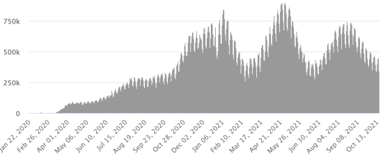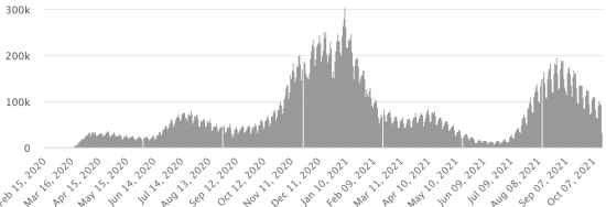 SITUATION MONDIALE : Situation épidémiologique : Dimanche 17 octobre 2021 le nombre de personnes contaminées dans le monde par le coronavirus Covid-19 depuis le début de la pandémie (Source officielle), s’élève à 241,208,438 cas (+310,864 en 24h), la veille (+480,716) Nombre de pays contaminés : 221 *Guérisons : 218,459,323 personnes ont été guéries du Covid-19 dans le monde (+312,637 en 24h), la veille (+432,127) *Décès : 4,910,602 personnes sont mortes du Covid-19 dans le monde (+4,324 en 24h), la veille (+8,561) *Cas actifs (moins décès et guérisons) dans le monde est actuellement de 17,838,513 cas (+6,097 en 24h), la veille (+44,028) Taux moyen de guérison au monde : 90,56% (+) Taux moyen de mortalité au monde : 2,03% (=) Monde : Nombre de cas confirmés quotidiens :