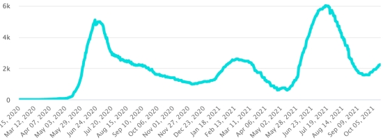 4ème vague : Le total de la 3ème vague (début 20 septembre 2021) s’élève à 1,459 cas confirmés (+109) et 47 décès (+0). Mise à jour 11 octobre 2021. Cas testés depuis le début de la pandémie : 126,473 cas (+701 en 24h) mise à jour 11 octobre 2021 dernières données disponibles. Notez que le très faible nombre de personnes testées ne permet pas statistiquement de faire une estimation représentative des cas actifs de Covid-19 en Haïti. Ce qui explique également le faible nombre de cas détecté quotidiennement. À titre de comparaison la République voisine a réalisé plus de 2,1millions de tests sur sa population depuis le début de l’épidémie. TOP 5 des Communes les plus touchées dans l’Ouest (2021) : Delmas : 2,218 (+17) ; Pétion ville 1,794 (+11) ; Port-au-Prince 1,215 (+12) ; Croix-des-Bouquets 976 (+2) ; Tabarre 962 (+6). Cas confirmés par département (2021) : Ouest : 8,346 cas (2020 : 6,945 cas) Nord : 558 cas (2020 : 677 cas) Centre : 770 cas (2020 : 508 cas) Artibonite : 643 cas (2020 : 593 cas) Nord-Est : 322 cas (2020 : 314 cas) Sud-Est : 475 cas (2020 : 274 cas) Sud : 643 cas (2020 : 262 cas) Nord-Ouest : 310 cas (2020 : 229 cas) Grand'Anse : 651 cas (2020 : 176 cas) Nippes : 197 cas (2020 : 149 cas) Décès cumulés par département (2021) : Ouest : 214 décès (2020 : 104 décès) Nord : 43 décès (2020 : 34 décès) Centre : 34 décès (2020 : 13 décès) Artibonite : 25 décès (2020 : 39 décès) Nord-Est : 8 décès (2020 : 6 décès) Sud : 37 décès (2020 : 6 décès) Sud-Est : 11 décès (2020 : 9 décès) Nord-Ouest : 12 décès (2020 : 12 décès) Grand'Anse : 7 décès (2020 : 13 décès) Nippes : 23 décès (2020 : 5 décès) Répartition des décès par âge (depuis le début de l’épidémie) : 0-9 ans : 13 décès 10-19 ans : 6 décès 20-29 ans : 25 décès 30-39 ans : 42 décès 40-49 ans : 68 décès 50-59 ans : 109 décès 60-69 ans : 149 décès 70-79 ans : 144 décès (+1) 80 ans et plus : 101 décès Vaccination : 95,732 (+7,940 en 3 jours) doses de vaccin « Spikevax » (appellation officielle) du Laboratoire MODERNA ont été injectées au total en Haïti depuis le 16 juillet 2021, date de la première injection. 26,694 personnes sont entièrement vaccinées (2 doses). Mise à jour 10 octobre 2021, dernières données disponibles. Liste des 128 Centres de vaccination ouverts en Haïti (et horaires) par département : (mise à jour 11 octobre 2021) DIASPORA : Situation épidémiologique : USA : *Cas depuis le premier cas (9 mars 2020) : 45,908,212 cas (+11,568 en 24h), la veille (+18,357) *Guérisons : 35,573,510 guérisons (+198,915 en 24h), la veille (+22,252) Taux national de Guérison : 77,48% (+) *Décès : 746,509 décès (+1,963 en 24h), la veille (+161) Taux national de mortalité : 1,62% (=) *Cas actifs (moins décès et guérisons) : 9,588,193 cas (-85,198), la veille (-4,056) *Tests : 672,533,278 personnes testées depuis le premier cas USA : Nombre de cas confirmés quotidiens :