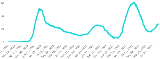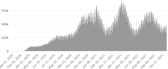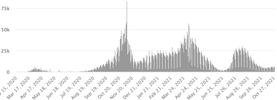 4ème vague : Le total de la 3ème vague (début 20 septembre 2021) s’élève à 2,240 cas confirmés (+213) et 52 décès (+0 en 24h). Mise à jour 22 octobre 2021. Cas testés depuis le début de la pandémie : 131,013 cas (+284 en 24h) mise à jour 22 octobre 2021 dernières données disponibles. Notez que le très faible nombre de personnes testées ne permet pas statistiquement de faire une estimation représentative des cas actifs de Covid-19 en Haïti. Ce qui explique également le faible nombre de cas détecté quotidiennement. À titre de comparaison la République voisine a réalisé plus de 2,1millions de tests sur sa population depuis le début de l’épidémie. TOP 5 des Communes les plus touchées dans l’Ouest (2021) : Delmas : 2,363 (+13) ; Pétion ville 1,855 (+1) ; Port-au-Prince 1,288 (+8) ; Tabarre 1,023 (+6) ; Croix-des-Bouquets 1,014 (+5) Cas confirmés par département (2021) : Ouest : 8,769 cas (2020 : 6,945 cas) Nord : 588 cas (2020 : 677 cas) Centre : 821 cas (2020 : 508 cas) Artibonite : 699 cas (2020 : 593 cas) Nord-Est : 346 cas (2020 : 314 cas) Sud-Est : 529 cas (2020 : 274 cas) Sud : 652 cas (2020 : 262 cas) Nord-Ouest : 327 cas (2020 : 229 cas) Grand'Anse : 753 cas (2020 : 176 cas) Nippes : 212 cas (2020 : 149 cas) Décès cumulés par département (2021) : Ouest : 217 décès (2020 : 104 décès) Nord : 45 décès (2020 : 34 décès) Centre : 34 décès (2020 : 13 décès) Artibonite : 26 décès (2020 : 39 décès) Nord-Est : 6 décès (2020 : 6 décès) Sud : 39 décès (2020 : 6 décès) Sud-Est : 12 décès (2020 : 9 décès) Nord-Ouest : 12 décès (2020 : 12 décès) Grand'Anse : 7 décès (2020 : 13 décès) Nippes : 23 décès (2020 : 5 décès) Répartition des décès par âge (depuis le début de l’épidémie) : 0-9 ans : 13 décès 10-19 ans : 6 décès 20-29 ans : 25 décès 30-39 ans : 42 décès 40-49 ans : 69 décès 50-59 ans : 110 décès 60-69 ans : 150 décès 70-79 ans : 146 décès 80 ans et plus : 101 décès Vaccination : 118,202 (+22,470 en 13 jours) doses de vaccin « Spikevax » (appellation officielle) du 20 octobre Laboratoire MODERNA ont été injectées au total en Haïti depuis le 16 juillet 2021, date de la première injection. 31,540 personnes sont entièrement vaccinées (2 doses). Mise à jour 20 octobre 2021, dernières données disponibles. Liste des 149 Centres de vaccination ouverts en Haïti (et horaires) par département : (mise à jour 20 octobre 2021) DIASPORA : Situation épidémiologique : USA : *Cas depuis le premier cas (9 mars 2020) : 46,685,145 cas (+88,142 en 24h), la veille (+99,284) *Guérisons : 36,565,948 guérisons (+89,192 en 24h), la veille (+101,567) Taux national de Guérison : 78,32% (+) *Décès : 763,784 décès (+1,928 en 24h), la veille (+1,924) Taux national de mortalité : 1,63% (=) *Cas actifs (moins décès et guérisons) : 9,355,413 cas (-2,978), la veille (-4,207) *Tests : 696,084,706 personnes testées depuis le premier cas USA : Nombre de cas confirmés quotidiens :