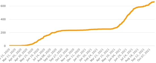 Vaccination : 6,97 millards de doses de vaccin injectées (+30 millions de doses injectées en 24h. Mise à jour 28 octobre 2021 (dernières données disponibles). HAÏTI : Situation épidémiologique : Avertissement : Le Ministère de la Santé Publique et de la Population (MSPP) n’as pas rendu disponible après le 22 octobre 2021 les données quotidiennes sur la situation du Covid-19 en Haïti. En conséquence, les données ci-dessous sur la situation en Haïti sont les dernières disponibles. Selon le Ministère de la Santé Publique, +50 nouveaux cas en 24h de Covid-19 et de ses variants auraient été confirmés en Haïti le 22 octobre 2021 (dernières données partielles disponibles) pour un total de 23,823 cas confirmés sur l’ensemble du territoire national (46.9% de femmes et 53.1% hommes), depuis le premier cas (19 mars 2020 https://www.haitilibre.com/article-30319-haiti-sante-origine-des-2-premiers-cas-de-covid-19-en-haiti.html ). Précédente mise à jour (+154 cas les 20 et 21 octobre). Guérisons : 20,286 (+20 en 24h) Taux de guérison : 85,15% (-) Décès : 662 décès +0 en 24h () Taux de mortalité : 2,77% (-) Haïti : Tendance des décès :