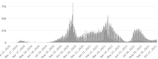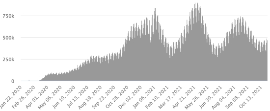 4ème vague : Le total de la 3ème vague (début 20 septembre 2021) s’élève à 2,240 cas confirmés (+213) et 52 décès (+0 en 24h). Mise à jour 22 octobre 2021. Cas testés depuis le début de la pandémie : 131,013 cas (+284 en 24h) mise à jour 22 octobre 2021 dernières données disponibles. Notez que le très faible nombre de personnes testées ne permet pas statistiquement de faire une estimation représentative des cas actifs de Covid-19 en Haïti. Ce qui explique également le faible nombre de cas détecté quotidiennement. À titre de comparaison la République voisine a réalisé plus de 2,2 millions de tests sur sa population depuis le début de l’épidémie. TOP 5 des Communes les plus touchées dans l’Ouest (2021) : Delmas : 2,363 (+13) ; Pétion ville 1,855 (+1) ; Port-au-Prince 1,288 (+8) ; Tabarre 1,023 (+6) ; Croix-des-Bouquets 1,014 (+5) Cas confirmés par département (2021) : Ouest : 8,769 cas (2020 : 6,945 cas) Nord : 588 cas (2020 : 677 cas) Centre : 821 cas (2020 : 508 cas) Artibonite : 699 cas (2020 : 593 cas) Nord-Est : 346 cas (2020 : 314 cas) Sud-Est : 529 cas (2020 : 274 cas) Sud : 652 cas (2020 : 262 cas) Nord-Ouest : 327 cas (2020 : 229 cas) Grand'Anse : 753 cas (2020 : 176 cas) Nippes : 212 cas (2020 : 149 cas) Décès cumulés par département (2021) : Ouest : 217 décès (2020 : 104 décès) Nord : 45 décès (2020 : 34 décès) Centre : 34 décès (2020 : 13 décès) Artibonite : 26 décès (2020 : 39 décès) Nord-Est : 6 décès (2020 : 6 décès) Sud : 39 décès (2020 : 6 décès) Sud-Est : 12 décès (2020 : 9 décès) Nord-Ouest : 12 décès (2020 : 12 décès) Grand'Anse : 7 décès (2020 : 13 décès) Nippes : 23 décès (2020 : 5 décès) Répartition des décès par âge (depuis le début de l’épidémie) : 0-9 ans : 13 décès 10-19 ans : 6 décès 20-29 ans : 25 décès 30-39 ans : 42 décès 40-49 ans : 69 décès 50-59 ans : 110 décès 60-69 ans : 150 décès 70-79 ans : 146 décès 80 ans et plus : 101 décès Vaccination : 118,202 (+22,470 en 13 jours) doses de vaccin « Spikevax » (appellation officielle) du 20 octobre Laboratoire MODERNA ont été injectées au total en Haïti depuis le 16 juillet 2021, date de la première injection. 31,540 personnes sont entièrement vaccinées (2 doses). Mise à jour 20 octobre 2021, dernières données disponibles. Liste des 149 Centres de vaccination ouverts en Haïti (et horaires) par département : (mise à jour 20 octobre 2021) DIASPORA : Situation épidémiologique : USA : *Cas depuis le premier cas (9 mars 2020) : 46,771,979 cas (+86,834 en 24h), la veille (+88,142) *Guérisons : 36,646,900 guérisons (+80,952 en 24h), la veille (+89,192) Taux national de Guérison : 78,35% (+) *Décès : 765,722 décès (+1,938 en 24h), la veille (+1,928) Taux national de mortalité : 1,63% (=) *Cas actifs (moins décès et guérisons) : 9,359,357 cas (+3,944), la veille (-2,978) *Tests : 697,847,798 personnes testées depuis le premier cas USA : Nombre de cas confirmés quotidiens :
