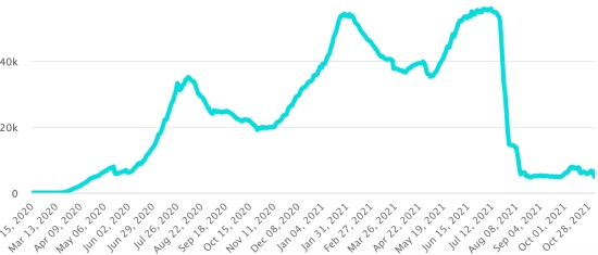 4ème vague : Le total de la 3ème vague (début 20 septembre 2021) s’élève à 2,421 cas confirmés (+21) et 67 décès (+4 en 24h). Mise à jour 27 octobre 2021. Cas testés depuis le début de la pandémie : 131,997 cas (+115 en 24h) mise à jour 26 octobre 2021 dernières données disponibles. Notez que le très faible nombre de personnes testées ne permet pas statistiquement de faire une estimation représentative des cas actifs de Covid-19 en Haïti. Ce qui explique également le faible nombre de cas détecté quotidiennement. À titre de comparaison la République voisine a réalisé plus de 2,2 millions de tests sur sa population depuis le début de l’épidémie. TOP 5 des Communes les plus touchées dans l’Ouest (2021) : Delmas : 2,382 (+3) ; Pétion ville 1,869 (+0) ; Port-au-Prince 1,297 (+0) ; Tabarre 1,040 (+2) ; Croix-des-Bouquets 1,026 (+0) Cas confirmés par département (2021) : Ouest : 8,848 cas (2020 : 6,945 cas) Nord : 615 cas (2020 : 677 cas) Centre : 836 cas (2020 : 508 cas) Artibonite : 720 cas (2020 : 593 cas) Nord-Est : 351 cas (2020 : 314 cas) Sud-Est : 541 cas (2020 : 274 cas) Sud : 654 cas (2020 : 262 cas) Nord-Ouest : 331cas (2020 : 229 cas) Grand'Anse : 768 cas (2020 : 176 cas) Nippes : 213 cas (2020 : 149 cas) Décès cumulés par département (2021) : Ouest : 222 décès (2020 : 104 décès) Nord : 48 décès (2020 : 34 décès) Centre : 34 décès (2020 : 13 décès) Artibonite : 29 décès (2020 : 39 décès) Nord-Est : 6 décès (2020 : 6 décès) Sud : 39 décès (2020 : 6 décès) Sud-Est : 12 décès (2020 : 9 décès) Nord-Ouest : 15 décès (2020 : 12 décès) Grand'Anse : 7 décès (2020 : 13 décès) Nippes : 24 décès (2020 : 5 décès) Répartition des décès par âge (depuis le début de l’épidémie) : 0-9 ans : 13 décès 10-19 ans : 6 décès 20-29 ans : 25 décès 30-39 ans : 43 décès 40-49 ans : 69 décès 50-59 ans : 111 décès 60-69 ans : 153 décès 70-79 ans : 152 décès (+1) 80 ans et plus : 105 décès (+1) Vaccination : 135,256 (+12,095 en 6 jours) doses de vaccin « Spikevax » (appellation officielle) du 20 octobre Laboratoire MODERNA ont été injectées au total en Haïti depuis le 16 juillet 2021, date de la première injection. 39,676 personnes sont entièrement vaccinées (2 doses). Mise à jour 31 octobre 2021, dernières données disponibles. Liste des 149 Centres de vaccination ouverts en Haïti (et horaires) par département : (mise à jour 20 octobre 2021) DIASPORA : Situation épidémiologique : USA : *Cas depuis le premier cas (9 mars 2020) : 47,105,468 cas (+105,697 en 24h), la veille (+68,487) *Guérisons : 37,116,604 guérisons (+106,614 en 24h), la veille (+128,154) Taux national de Guérison : 78,79% (+) *Décès : 770,854 décès (+2,007 en 24h), la veille (+1,411) Taux national de mortalité : 1,63% (=) *Cas actifs (moins décès et guérisons) : 9,218,010 cas (-2,924), la veille (-61,078) *Tests : 705,145,283 personnes testées depuis le premier cas USA : Nombre de cas confirmés quotidiens :