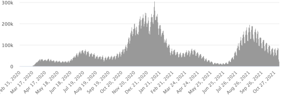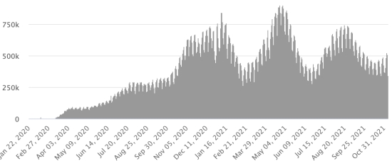 Vaccination : 430,93 millions de doses de vaccin injectées depuis le 14 décembre 2020 date de la première injection aux États-Unis (1,49 millions de doses injectées en 24h). Mise à jour 7 novembre 2021 (dernières données disponibles).