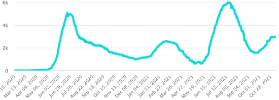 Vaccination : 7,34 millards de doses de vaccin injectées (+30 millions de doses injectées en 24h. Mise à jour 9 novembre 2021 (dernières données disponibles). HAÏTI : Situation épidémiologique : Avertissement : Le Ministère de la Santé Publique et de la Population (MSPP) n’as pas rendu disponible après le 3 novembre 2021 les données quotidiennes sur la situation du Covid-19 en Haïti. En conséquence, les données ci-dessous sur la situation en Haïti sont les dernières disponibles. Selon le Ministère de la Santé Publique, +123 nouveaux cas en 48h de Covid-19 et de ses variants auraient été confirmés en Haïti les 2 et 3 novembre 2021 (dernières données partielles disponibles) pour un total de 24,233 cas confirmés sur l’ensemble du territoire national (47.1% de femmes et 52.9% hommes), depuis le premier cas (19 mars 2020 https://www.haitilibre.com/article-30319-haiti-sante-origine-des-2-premiers-cas-de-covid-19-en-haiti.html ). Précédente mise à jour (+48 cas les 31 octobre et 1er novembre). Guérisons : 20,551 (+45 en 48h) Taux de guérison : 84,80% (-) Décès : 702 décès +10 en 48h (Ouest +6, Centre +1, Artibonite +3) Taux de mortalité : 2,85% (-) Haïti : Tendance des décès :