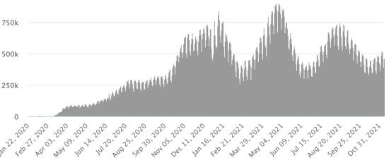 SITUATION MONDIALE : Situation épidémiologique : Mercredi 10 novembre 2021 le nombre de personnes contaminées dans le monde par le coronavirus Covid-19 depuis le début de la pandémie (Source officielle), s’élève à 251,683,072 cas (+556,250 en 24h), la veille (+472,546) Nombre de pays contaminés : 221 *Guérisons : 227,866,023 personnes ont été guéries du Covid-19 dans le monde (+492,527 en 24h), la veille (+474,822) *Décès : 5,082,478 personnes sont mortes du Covid-19 dans le monde (+10,036 en 24h), la veille (+6,847) *Cas actifs (moins décès et guérisons) dans le monde est actuellement de 18,734,571 cas (+53,687 en 24h), la veille (-9,123) Taux moyen de guérison au monde : 90,53% (-) Taux moyen de mortalité au monde : 2,23% (=) Monde : Nombre de cas confirmés quotidiens :