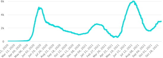 4ème vague : Le total de la 4ème vague (début 20 septembre 2021) s’élève à 2,776 cas confirmés et 95 décès. Cas testés depuis le début de la pandémie : 134,679 cas (+494 en 24h) dernières données disponibles. Notez que le très faible nombre de personnes testées ne permet pas statistiquement de faire une estimation représentative des cas actifs de Covid-19 en Haïti. Ce qui explique également le faible nombre de cas détecté quotidiennement. À titre de comparaison la République voisine a réalisé près de 2,3 millions de tests sur sa population depuis le début de l’épidémie. TOP 5 des Communes les plus touchées dans l’Ouest (2021) : Delmas : 2,463 (+7) ; Pétion ville 1,906 (+3) ; Port-au-Prince 1,336 (+9) ; Tabarre 1,078 (+7) ; Croix-des-Bouquets 1,053 (+3) Cas confirmés par département (2021) : Ouest : 9,079 cas (2020 : 6,945 cas) Nord : 628 cas (2020 : 677 cas) Centre : 849 cas (2020 : 508 cas) Artibonite : 749 cas (2020 : 593 cas) Nord-Est : 353 cas (2020 : 314 cas) Sud-Est : 595 cas (2020 : 274 cas) Sud : 659 cas (2020 : 262 cas) Nord-Ouest : 331 cas (2020 : 229 cas) Grand'Anse : 775 cas (2020 : 176 cas) Nippes : 214 cas (2020 : 149 cas) Décès cumulés par département (2021) : Ouest : 237 décès (2020 : 104 décès) Nord : 48 décès (2020 : 34 décès) Centre : 40 décès (2020 : 13 décès) Artibonite : 33 décès (2020 : 39 décès) Nord-Est : 6 décès (2020 : 6 décès) Sud : 41 décès (2020 : 6 décès) Sud-Est : 13 décès (2020 : 9 décès) Nord-Ouest : 15 décès (2020 : 12 décès) Grand'Anse : 7 décès (2020 : 13 décès) Nippes : 24 décès (2020 : 5 décès) Répartition des décès par âge (depuis le début de l’épidémie) : 0-9 ans : 13 décès 10-19 ans : 6 décès 20-29 ans : 25 décès 30-39 ans : 45 décès 40-49 ans : 73 décès 50-59 ans : 114 décès 60-69 ans : 161 décès (+1) 70-79 ans : 157 décès (+1) 80 ans et plus : 111 décès (+1) Vaccination : 135,256 (+12,095 en 6 jours) doses de vaccin « Spikevax » (appellation officielle) du 20 octobre Laboratoire MODERNA ont été injectées au total en Haïti depuis le 16 juillet 2021, date de la première injection. 39,676 personnes sont entièrement vaccinées (2 doses). Mise à jour 31 octobre 2021, dernières données disponibles. Liste des 149 Centres de vaccination ouverts en Haïti (et horaires) par département : (mise à jour 20 octobre 2021) DIASPORA : Situation épidémiologique : USA : *Cas depuis le premier cas (9 mars 2020) : 47,693,516 cas (+45,771 en 24h), la veille (+111,209) *Guérisons : 37,729,489 guérisons (+27,724 en 24h), la veille (+97,225) Taux national de Guérison : 79,10% (-) *Décès : 780,775 décès (+539 en 24h), la veille (+1,920) Taux national de mortalité : 1,63% (=) *Cas actifs (moins décès et guérisons) : 9,183,252 cas (+17,508), la veille (+12,064) *Tests : 716,695,749 personnes testées depuis le premier cas USA : Nombre de cas confirmés quotidiens :